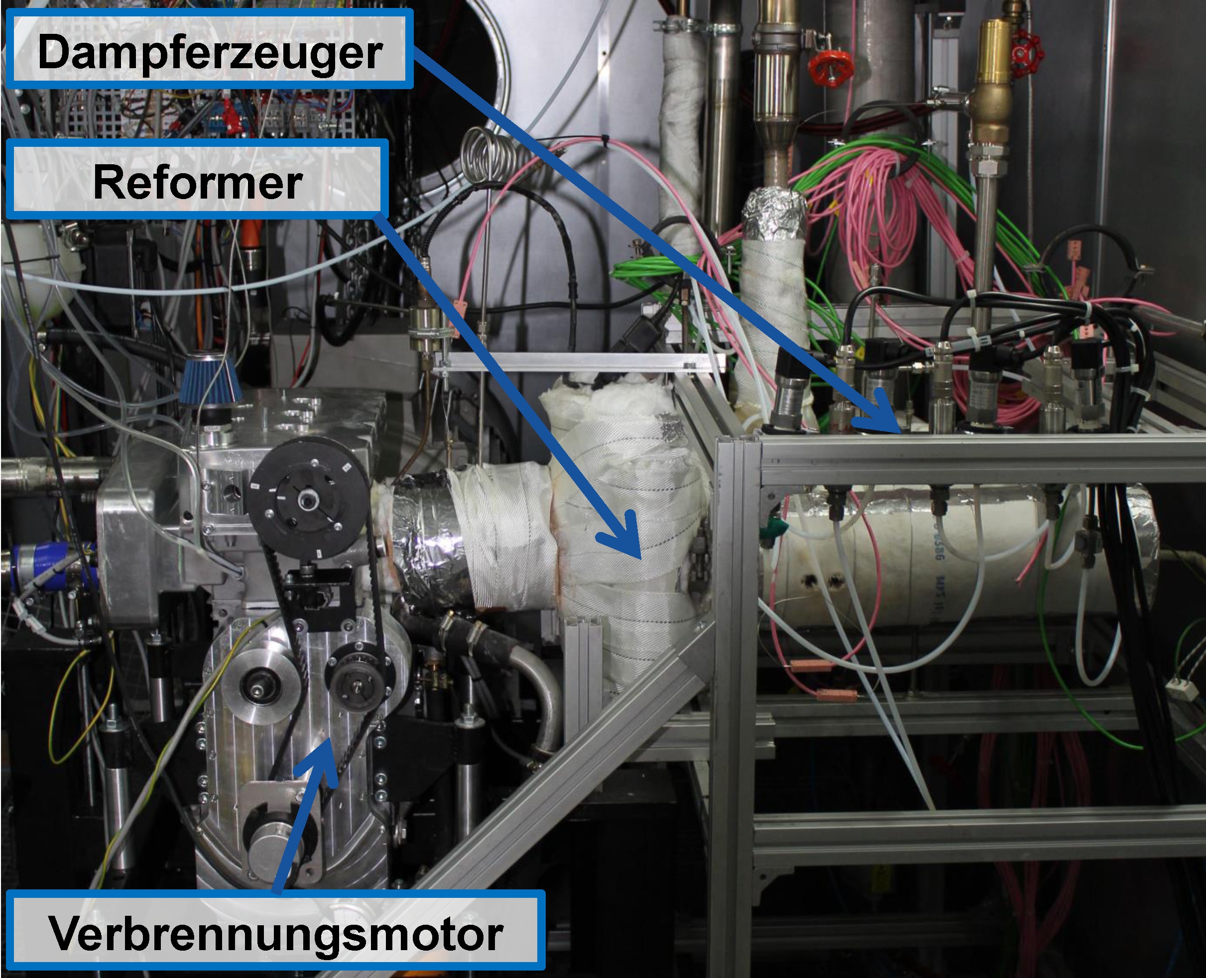Das Gesamtsystem besteht aus einem Erdgas-Verbrennungsmotor zur Stromerzeugung mit einer Leistung von 20 bis zu 40 kW elektrisch, einem Dampfreformer mit einem katalytisch beschichteten Plattenwärmetauscher und den benötigten Nebenaggregaten. Dieses Konzept wurde vom OWI bereits in ähnlicher Form für die Dampfreformierung von Dieselkraftstoff im Forschungsprojekt „MÖWE“ erfolgreich zum Betrieb von Brennstoffzellen eingesetzt. Um eine maximale Wirkungsgradsteigerung im gekoppelten Betrieb zu erzielen, wurden der Verbrennungsmotor (ECC) und Reformer (OWI) aufeinander abgestimmt. Der Betrieb unter Bedingungen im Hochtemperaturbereich oberhalb von 700 °C erforderte Neuentwicklungen von Komponenten. Um den Motor mit dem energiereicheren „Reformgas“ zu betreiben und die Reformgaserzeugung mit hoch wasserstoffhaltigen Brenngasen gefahrlos einzusetzen, war ein spezielles Saugrohr zu entwickeln. Zudem wurde der Motor hinsichtlich der Wärmeverluste so optimiert, dass eine möglichst hohe Abgastemperatur für die Reformierung zur Verfügung stand. In weiteren Entwicklungsschritten ist das Fernziel, die Technik auch auf mobile Anwendungsbereiche und alternative Kraftstoffe zu übertragen.