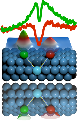 Abb.: Die Abbildung zeigt ein Paar von Eisenatomen (Kegel) auf der Oberfläche eines Platinkristalls, das mittels eines Rastertunnelmikroskops sichtbar gemacht wurde. Die Spektren des linken und rechten Atoms (grüne und rote Linie), die ebenfalls mit diesem Mikroskop aufgezeichnet wurden, zeigen charakteristische Stufen, aus denen die Wissenschaftler eine rechtsdrehende Magnetisierung der Atome erschließen, die durch die von der grünen zur roten Kugel rechtsdrehenden Pfeile symbolisiert wird. Der Grund für diese Rechtshändigkeit ist eine Art magnetischer Handschlag zwischen den beiden Eisenatomen, der über die Platinatome im Substrat (blaue Kugeln) übertragen wird. Diese Platinatome brechen die Spiegelsymmetrie der Struktur, wie anhand des Spiegelbildes in der Abbildung unten ersichtlich wird.