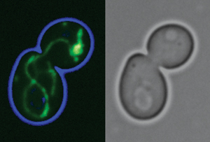 http://Fluoreszenzmikroskopie des mitochondrialen Netzwerkes (links, grün) und das entsprechende lichtmikroskopische Bild (rechts) einer sich teilenden Hefezelle. Bilder: Nils Wiedemann, Universität Freiburg