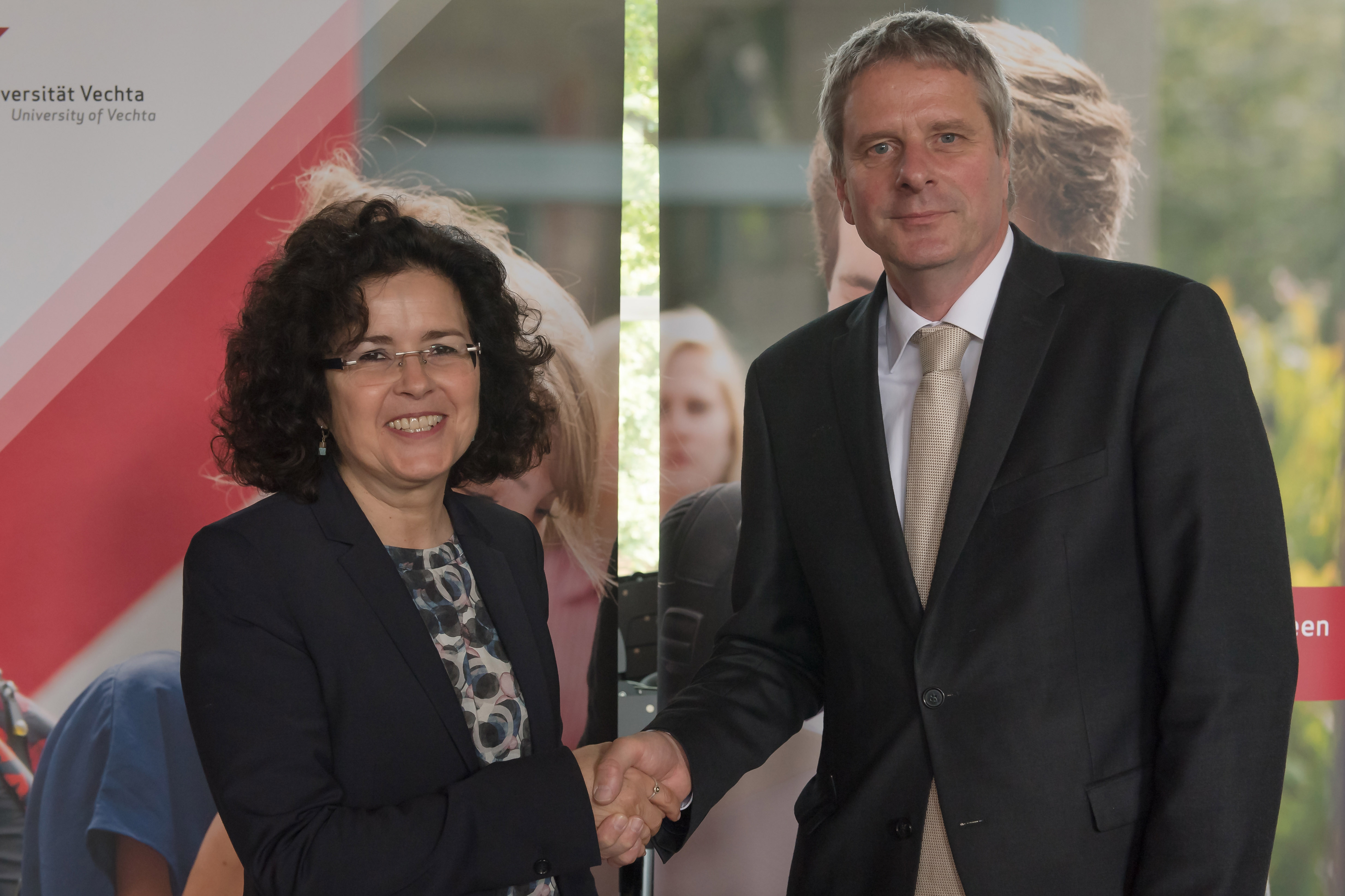 Nach der Begrüßung durch Dr. Marion Rieken, hauptamtliche Vizepräsidentin der Universität Vechta, sprach die Niedersächsische Wissenschaftsministerin Dr. Gabriele Heinen-Kljajić ihr Grußwort. „Die Universität Vechta ist ein fester Bestandteil der niedersächsischen Hochschullandschaft und trägt durch ihre Ausrichtung zum differenzierten Profil des Forschungsstandortes Niedersachsen bei. Mit seinen Erfahrungen im deutschen und französischen Wissenschaftssystem und seiner interkulturellen Kompetenz wird Prof. Dr. Burghart Schmidt wichtige Akzente für die Weiterentwicklung der Universität Vechta setzen.“ Zugleich dankte Heinen-Kljajić der langjährigen Präsidentin Prof. Dr. Marianne Assenmacher und der hauptberuflichen Vizepräsidentin Dr. Marion Rieken, die bis zum Amtsantritt von Prof. Dr. Burghart Schmidt die Geschäfte übernommen hatte.