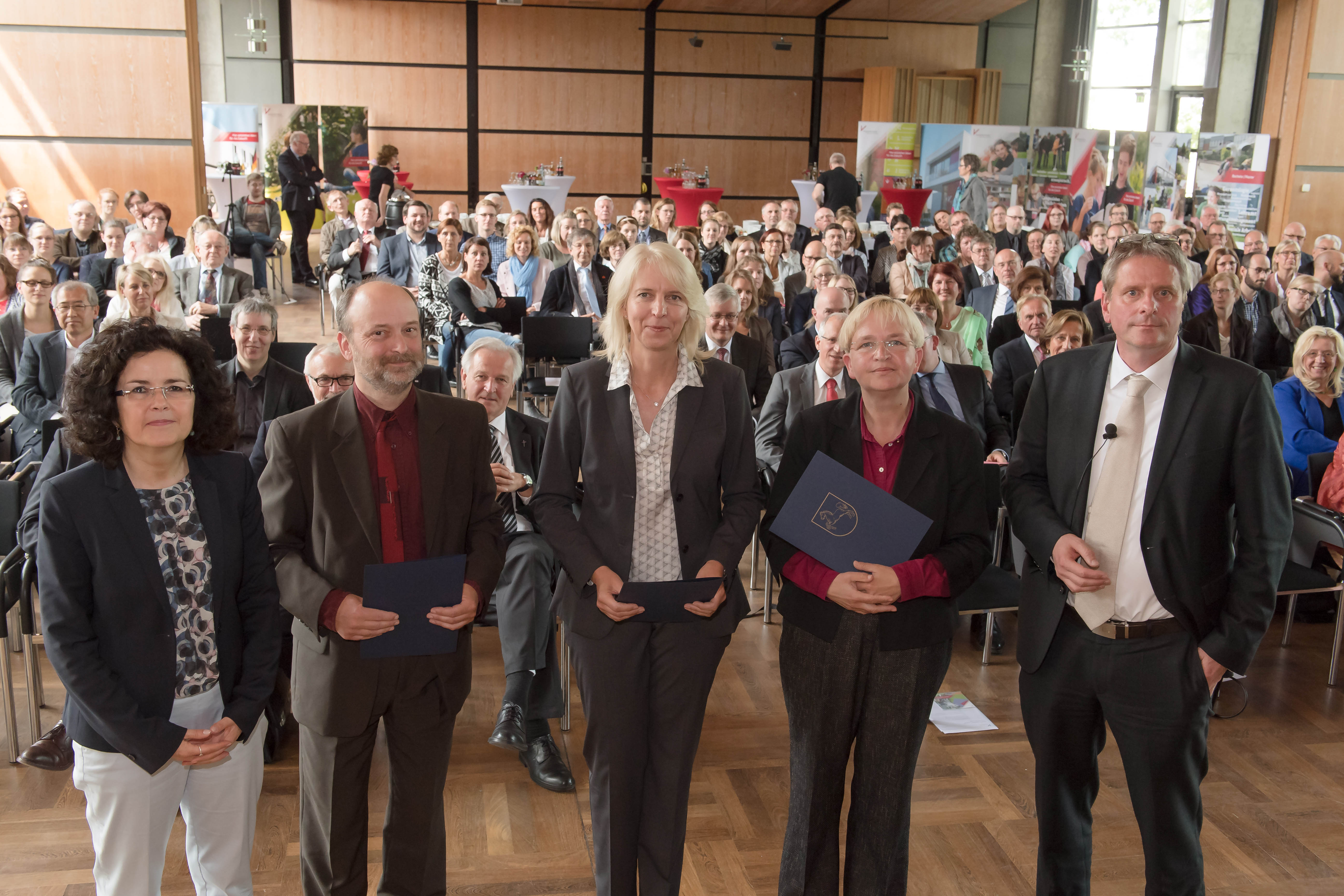 Als letzten Programmpunkt und Überraschung präsentierte die Ministerin noch die Ernennungsurkunden für die kürzlich neu gewählten Vizepräsidentinnen und –präsidenten: Ab 1. Juli wird neben Präsident Schmidt Dr. Marion Rieken als hauptamtliche Vizepräsidentin für Personal und Finanzen fungieren. An ihre Stelle im Ressort Lehre und Studium rückt die Mathematikdidaktikerin Prof. Dr. Martina Döhrmann. Komplettiert wird das Präsidium durch den Biologen Prof. Dr. Michael Ewig (Forschung und Nachwuchsförderung), der den amtierenden Prof. Dr. Norbert Lennartz (Anglistik) ablöst.