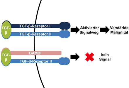 Auffälligerweise kommt gleichzeitig ein anderes Zelloberflächenprotein – das sogenannte BAMBI – in Lungentumorgeweben seltener vor. BAMBI ist Teil eines Pseudorezeptors, der – im Gegensatz zum funktionellen TGF-β-Rezeptor – kein Signal in die Zelle weiterleitet. Der funktionelle TGF-β-Rezeptor konkurriert mit dem BAMBI-Pseudorezeptor um die Bindung von TGF-β. Je weniger BAMBI-Protein sich also auf der Zelloberfläche befindet, desto mehr Signal wird über den funktionellen TGF-β-Rezeptor in die Zelle weitergeleitet. BAMBI ist somit ein negativer Regulator des TGF-β-Signalwegs. „Durch die verminderte Bildung von BAMBI steigert der Tumor seine Bösartigkeit“, kommentiert Dr. Sebastian Marwitz vom Forschungszentrum Borstel (DZL-Standort ARCN) die experimentellen Ergebnisse. Einen Grund für die verminderte Bildung von BAMBI konnten die Wissenschaftler ebenfalls finden: Der Promotor des BAMBI-Gens weist in Tumorzellen eine stärkere DNA-Methylierung auf, wodurch das Gen stillgeschaltet wird.