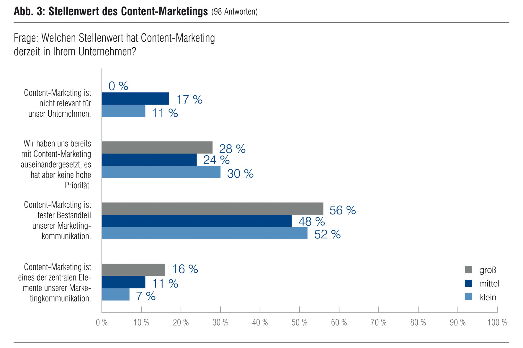 In mehr als der Hälfte der befragten Unternehmen ist Content-Marketing bereits zum festen Bestandteil der Unternehmenskommunikation geworden – für 16 Prozent der großen Unternehmen ist es sogar eines der zentralen Elemente der Marketingkommunikation. 52 Prozent der großen Unternehmen geben an, dass Content-Marketing ein sehr hohes Zukunftspotential hat. Allerdings: Nur jedes Fünfte der großen Unternehmen hat dafür ein schriftlich fixiertes, verabschiedetes Strategiekonzept.