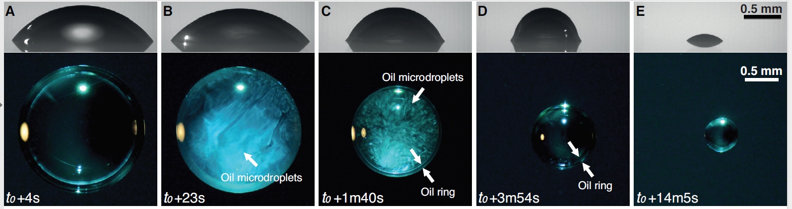 Das ändert sich jedoch, wenn sich das Anisöl zur Grenzfläche hin bewegt und eine Ecke bildet mit der Kugelkappenform des Tropfens und der Oberfläche. Die Anisöltropfen verschmelzen und bilden einen Ring aus Anisöl am Außenrand des Tropfens. Nach einer gewissen Zeit ist der Alkohol vollständig verdampft und die Flüssigkeit wird wieder transparent. Der Rest des Wassers verdampft ebenfalls, wobei der Anisölring von außen nach innen anwächst – bis schließlich ein kleiner Tropfen Anisöl übrig ist. Die insgesamt vier Lebensphasen vollziehen sich innerhalb einer Viertelstunde.