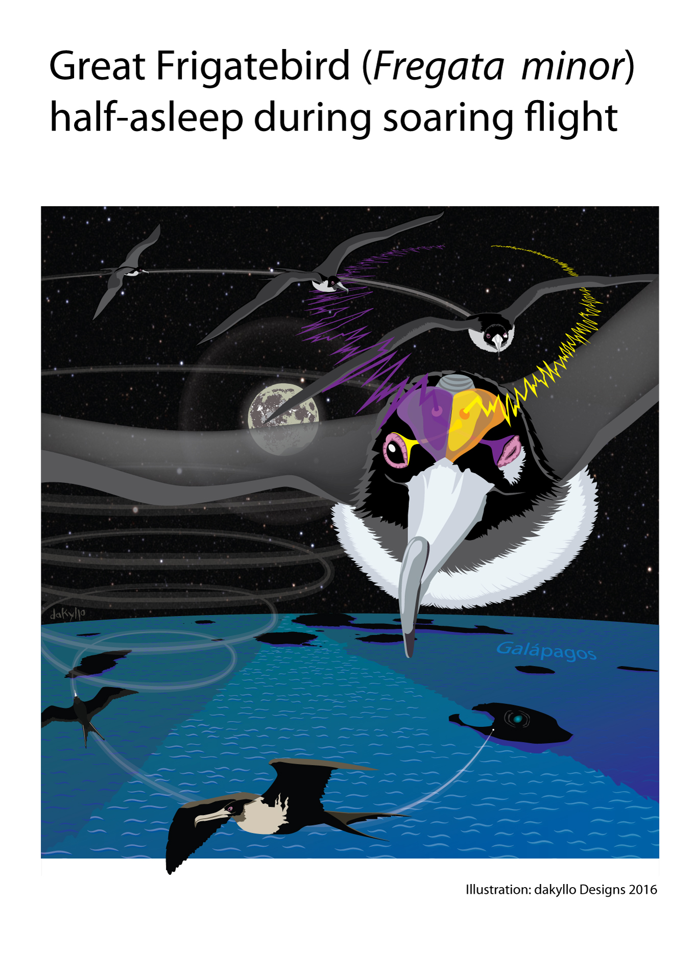 In Kooperation mit dem Galapagos Nationalpark und Sebastian Cruz, einem Seevogelforscher aus Ecuador, fokussierten die Wissenschaftler auf Fregattvögel, die auf den Galapagos-Inseln brüten. Diese große Seevogel-Art fliegt für Wochen ununterbrochen über dem Ozean und jagt fliegende Fische und Tintenfische, die von Raubfischen oder Walen an die Oberfläche getrieben werden. Die Forscher befestigten die mobilen Messgeräte für einige Zeit auf dem Kopf weiblicher Tiere, bevor diese zu ihren bis zu zehn Tage langen Jagdflügen von bis zu 3000 Kilometern Länge und bis zu zehn Tagen Dauer aufbrachen. Die Datenlogger registrierten neben den Gehirnströmen in beiden Gehirnhälften auch Kopfbewegungen, ein GPS-Gerät auf dem Rücken der Tiere die Flughöhe und ihre Position.