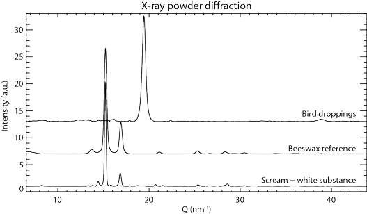 Um sicher zu gehen, wurden die Vogelkotproben ebenfalls bei PETRA III untersucht. "Dabei ist auf den ersten Blick zu erkennen, dass die Messdaten des Vogelkots nicht zu dem Material aus den weißen Flecken passen, dessen Messdaten sich jedoch mit Bienenwachs decken", sagt Falkenberg. "Zwar hängt die Zusammensetzung von Vogelkot auch stark von den Ernährungsgewohnheiten des jeweiligen Vogels ab", ergänzt Van der Snickt. "Ich bezweifle jedoch stark, dass Munchs Gemälde von Vögeln bekleckert wurde, die zufällig eine Vorliebe für Wachs hatten. Daher glaube ich, wir können den Fall des vermeintlichen Vogelkots jetzt schließen."