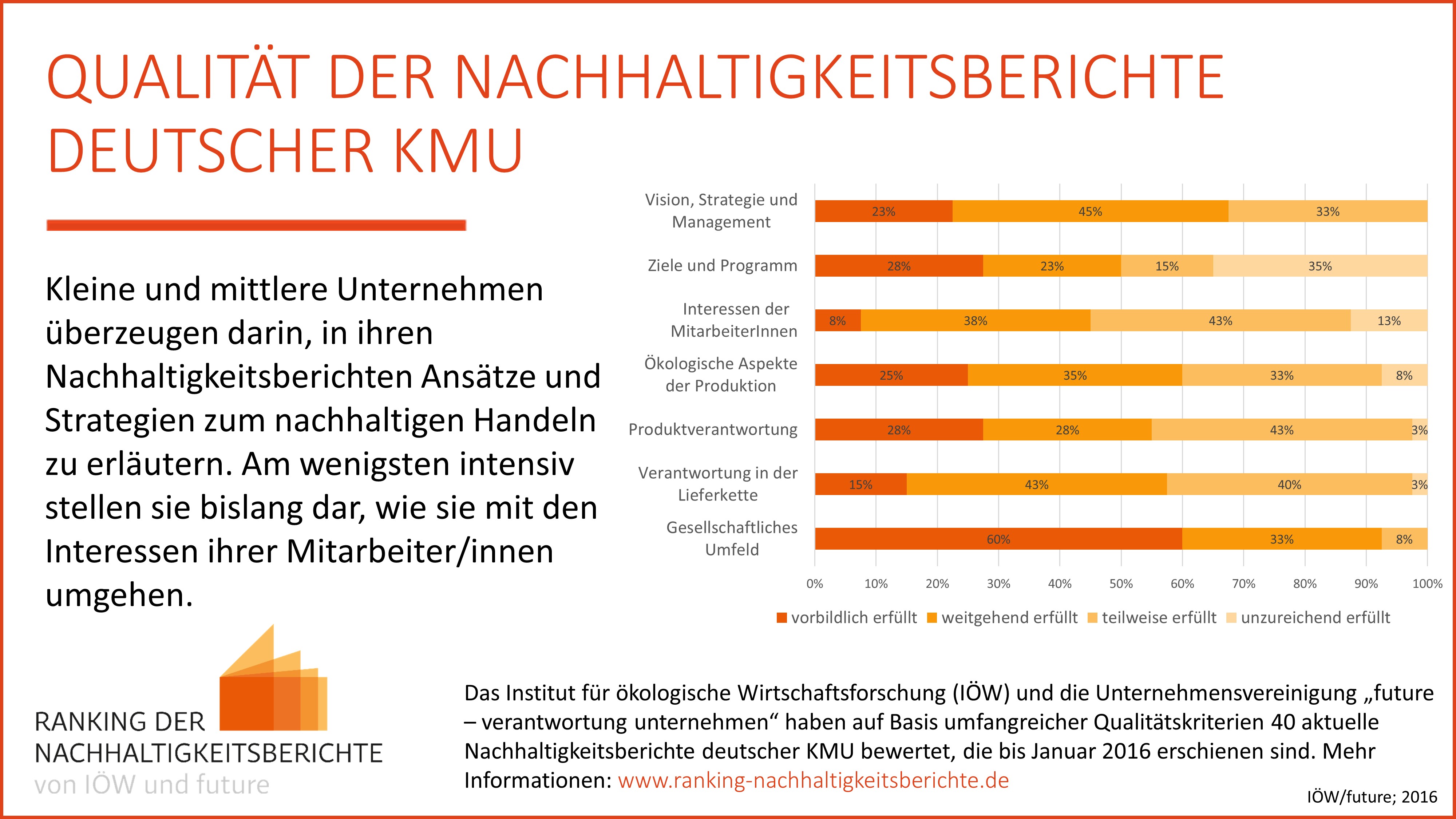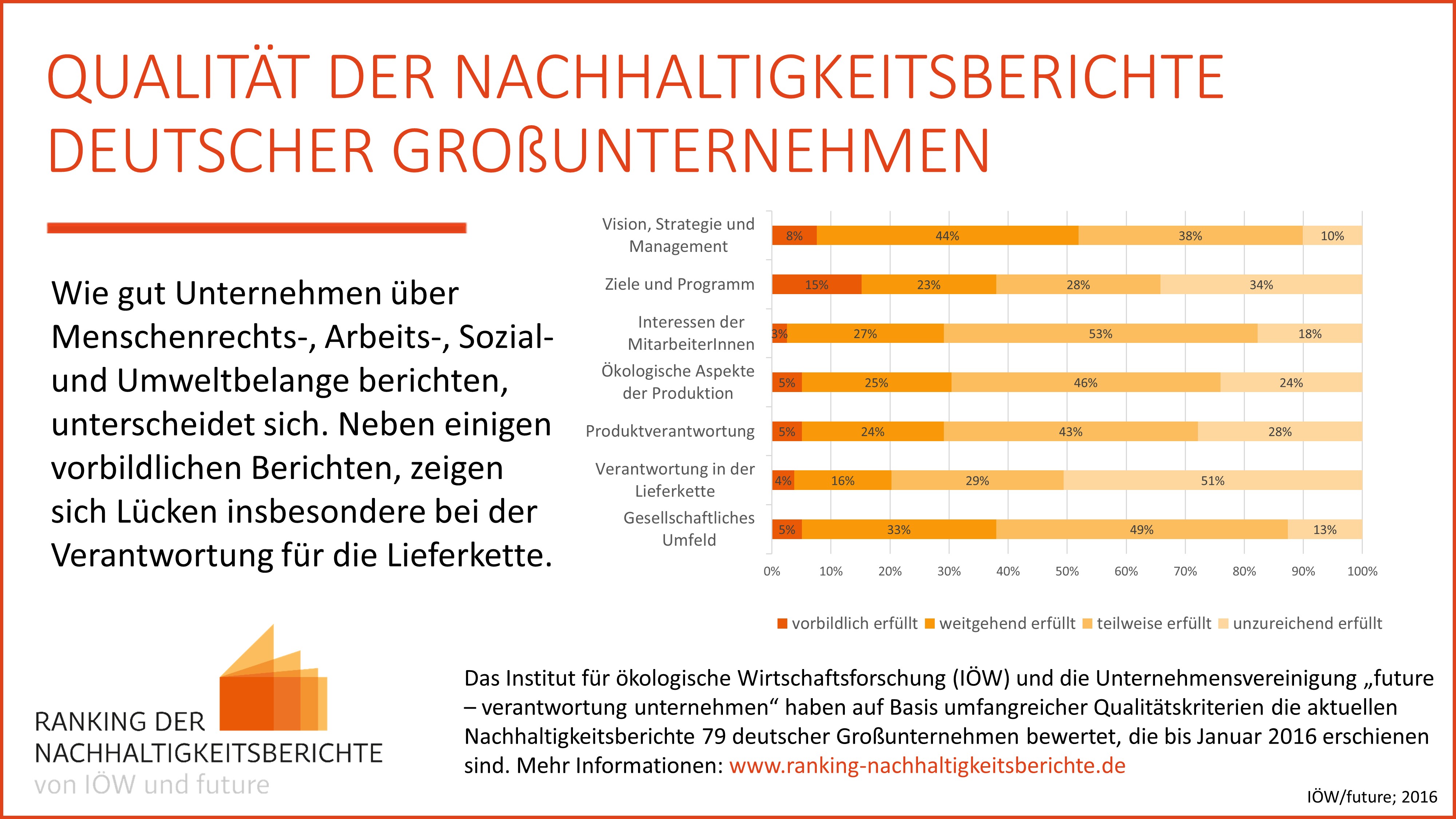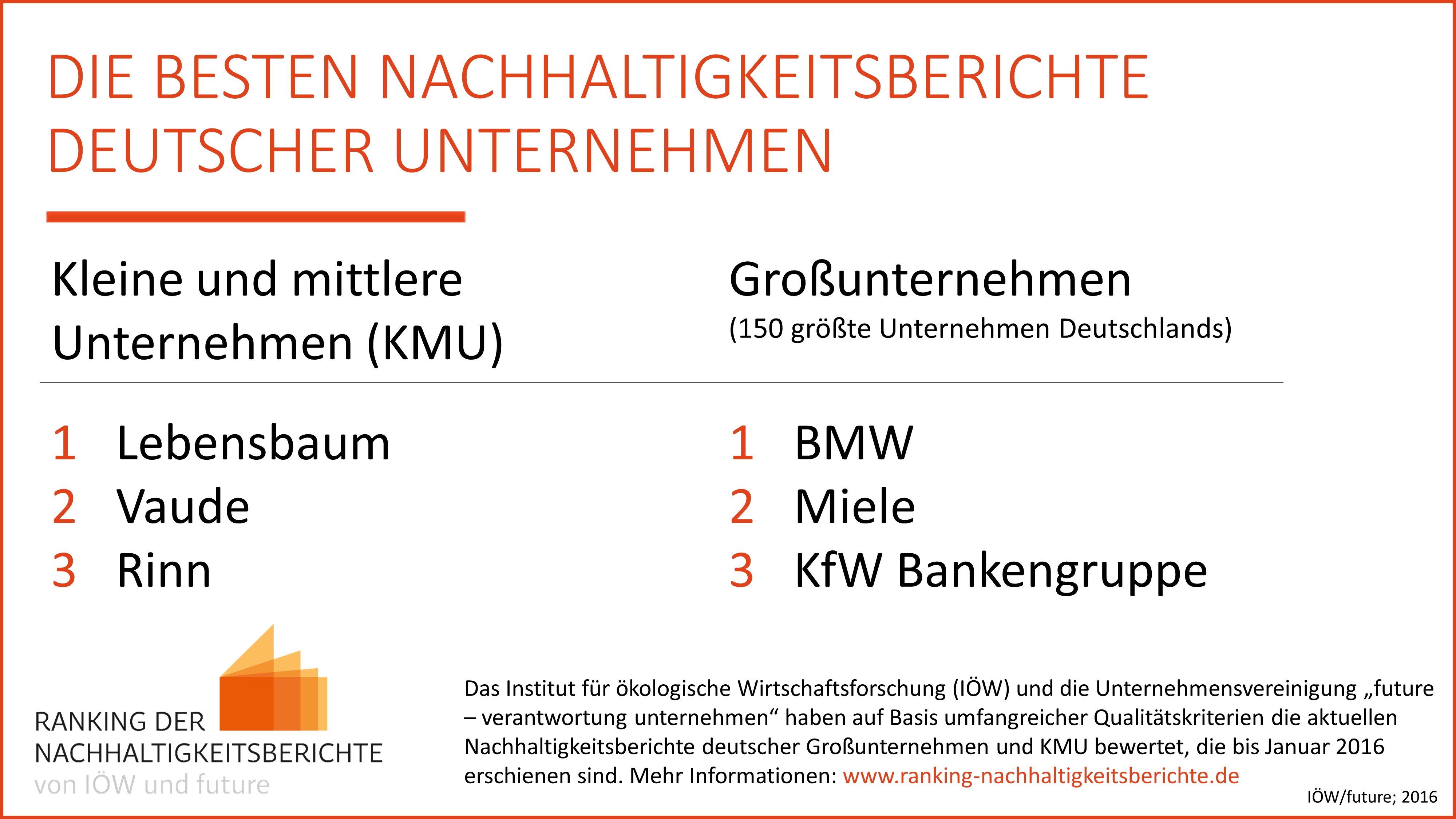 Das Ranking der Nachhaltigkeitsberichte von IÖW und future bewertet und prägt seit 1994 die Berichterstattung deutscher Unternehmen über ihre sozialen und ökologischen Herausforderungen und Aktivitäten. Es ist eine der weltweit ersten kriteriengestützten Bewertungen von Berichten, in denen Unternehmen auf freiwilliger Basis ihre ökologischen und sozialen Aktivitäten und Leistungen darstellen. Das Ranking der Nachhaltigkeitsberichte arbeitet unabhängig und wird mit Unterstützung des Bundesministeriums für Arbeit und Soziales durchgeführt. Mit dem Ranking verfolgen das IÖW und future das Ziel, auf eine Verbesserung der Qualität und Transparenz der Berichterstattung hinzuwirken.