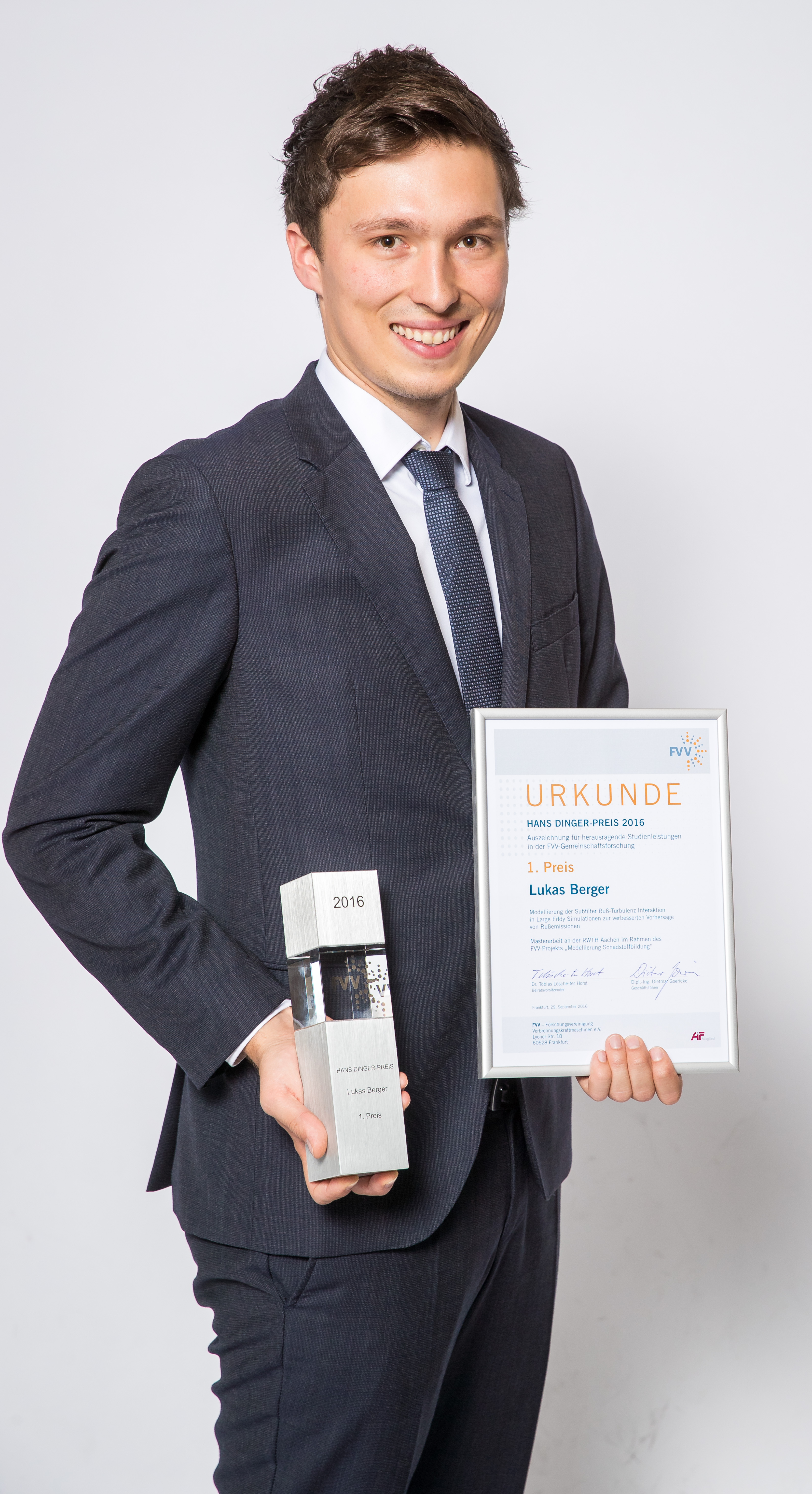 The 2016 award went to Lukas Berger, RWTH Aachen University, who studied in his master thesis the formation of soot emissions in aircraft gas turbine engines and developed a very fast operating simulation tool to enhance the prediction of the emissions.