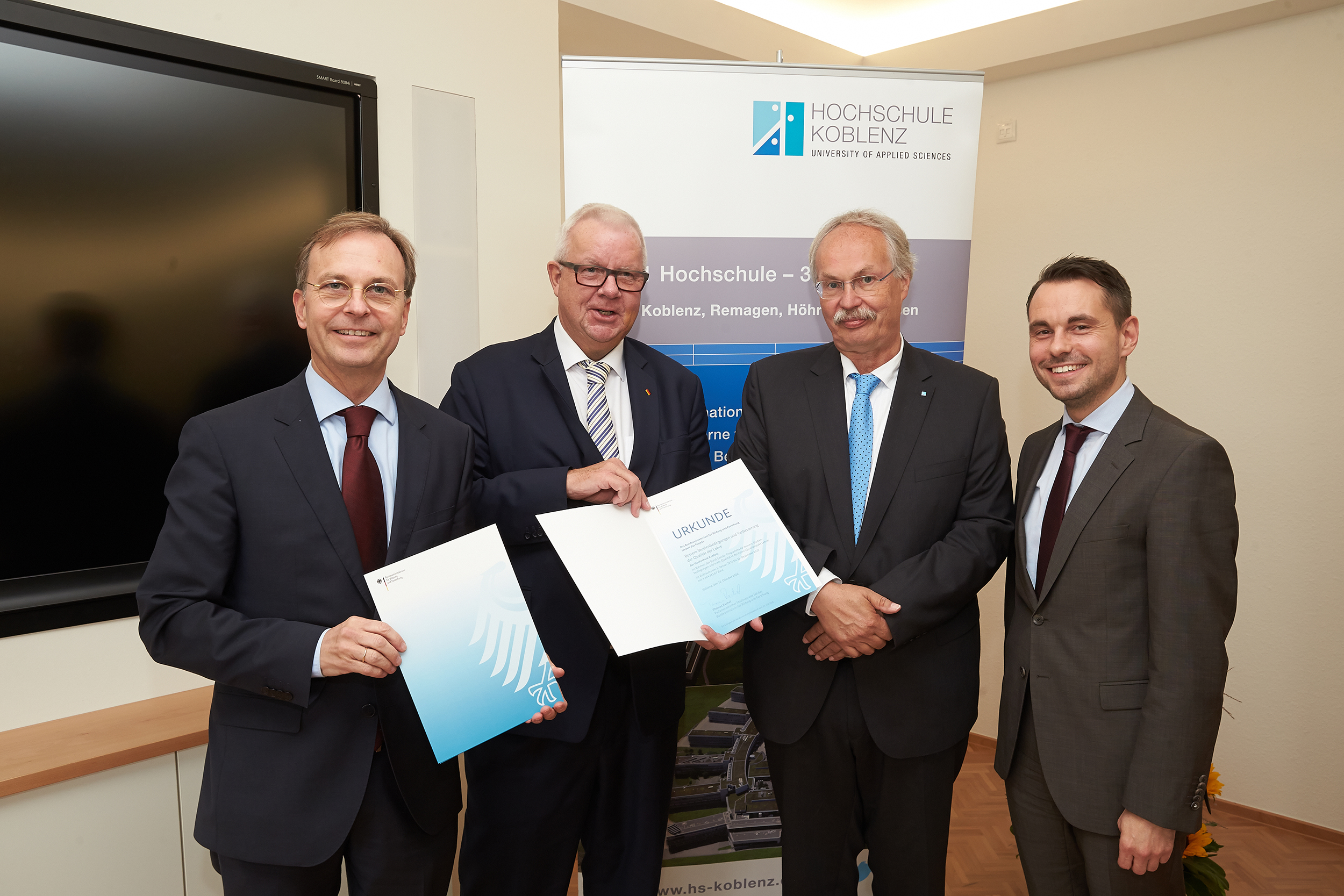Prof. Dr. Kristian Bosselmann-Cyran, Präsident der Hochschule Koblenz, freute sich sehr darüber, dass der Parlamentarische Staatssekretär des Bundesministeriums für Bildung und Forschung, Thomas Rachel MdB, die entsprechende Förderurkunde persönlich überreichte: „Wir haben selten so hohen Besuch aus Berlin am RheinMoselCampus und nutzen die Gelegenheit gerne, uns für die erneute Förderung zu bedanken. Die Summe wird uns helfen, unsere Hochschule auch für das nächste Jahrzehnt gut zu positionieren. Der Ausbau des Bereichs E-Learning, der der wachsenden Nachfrage nach flexiblen Lernorten und Lernzeiten Rechnung trägt, ist dabei ein ganz wichtiger Baustein.“