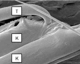 Das Anti-Zecken-Textil soll den Träger schützen, indem die Zecken nach dem ersten Anhaften in ihrem weiteren Marsch Richtung Haut stark eingeschränkt werden. Dabei verhaken sich die kleinen Spinnentiere oder versinken in oberflächlichen Fäden, sodass eine wirksame textile Barriere entsteht. An den hakenförmigen Blatthaaren isolierter Blätter der Gartenbohne (Phaseolus vulgaris) konnten die Wissenschaftler die Zecken-bremsende Wirkung bereits erfolgreich nachweisen. In einem weiteren Schritt kopierten die Forscher die Struktur der winzigen Blatthäkchen, um neuartige, funktionelle textile Oberflächen zu schaffen: Wie in der Natur durchbohrten dabei die Blatthaar-ähnlichen Strukturen die feinen Klauen erwachsener Zecken, wie die Untersuchungen belegen (siehe Abb. 1). Im nächsten Schritt soll nun in Laborversuchen die Barriere-Leistung des Anti-Zecken-Textils exakt bestimmt werden.