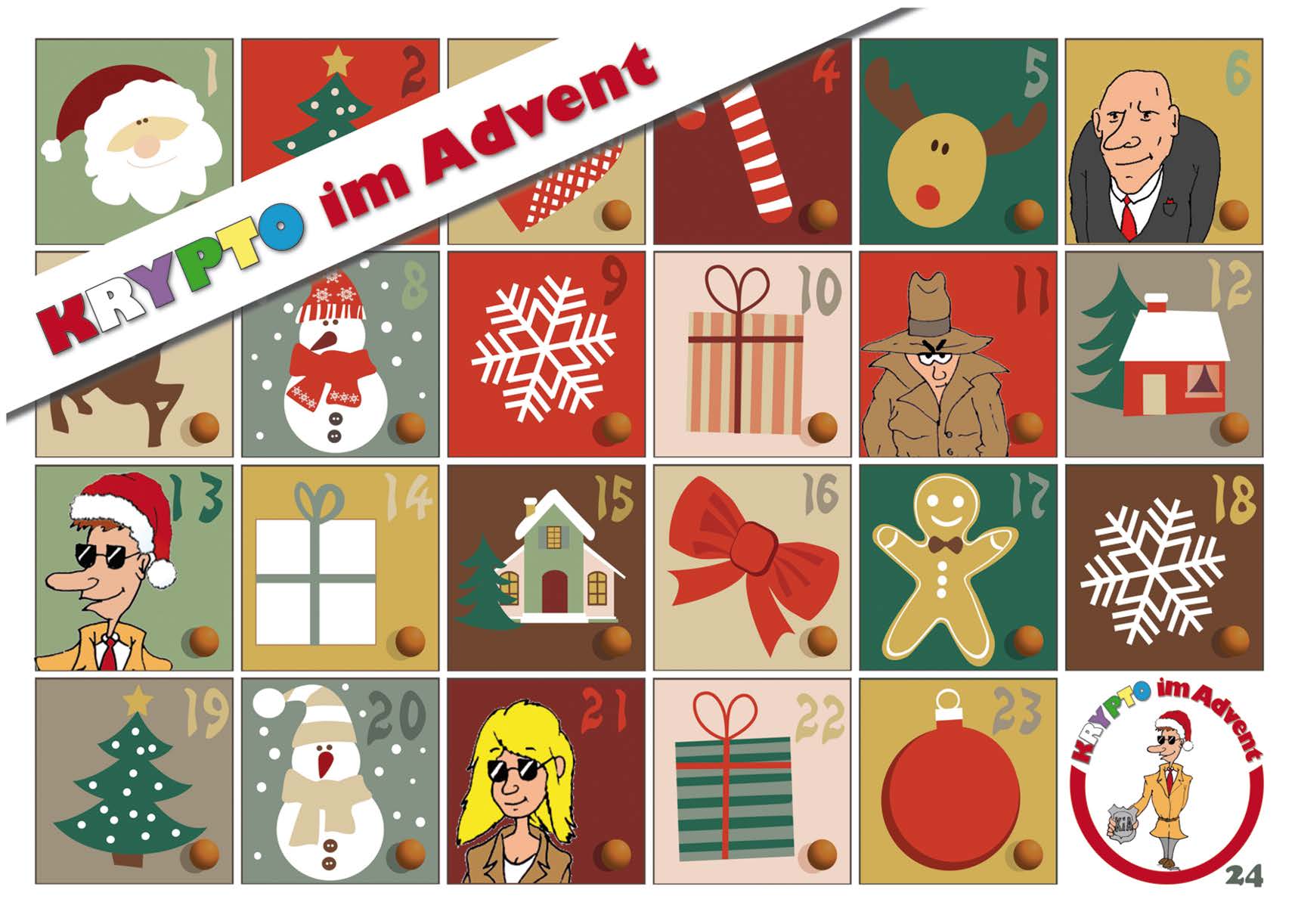 Vom 1. bis 24. Dezember sind Kinder und Jugendliche von 7-14 Jahren eingeladen, täglich ein neues Krypto-Rätsel zu knacken. Die Geheimagenten Krypto (ein Meister der Kryptologie) und Kryptina (Assistentin von Krypto) unterstützen sie bei ihrer Mission und erläutern alle relevanten Verschlüsselungsverfahren, wie z. B. die Bilderverschlüsselung, die B-Sprache, die Skytale, die Caesar-Verschlüsselung oder die Fleissner-Verschlüsslung, in kurzen Videoclips.