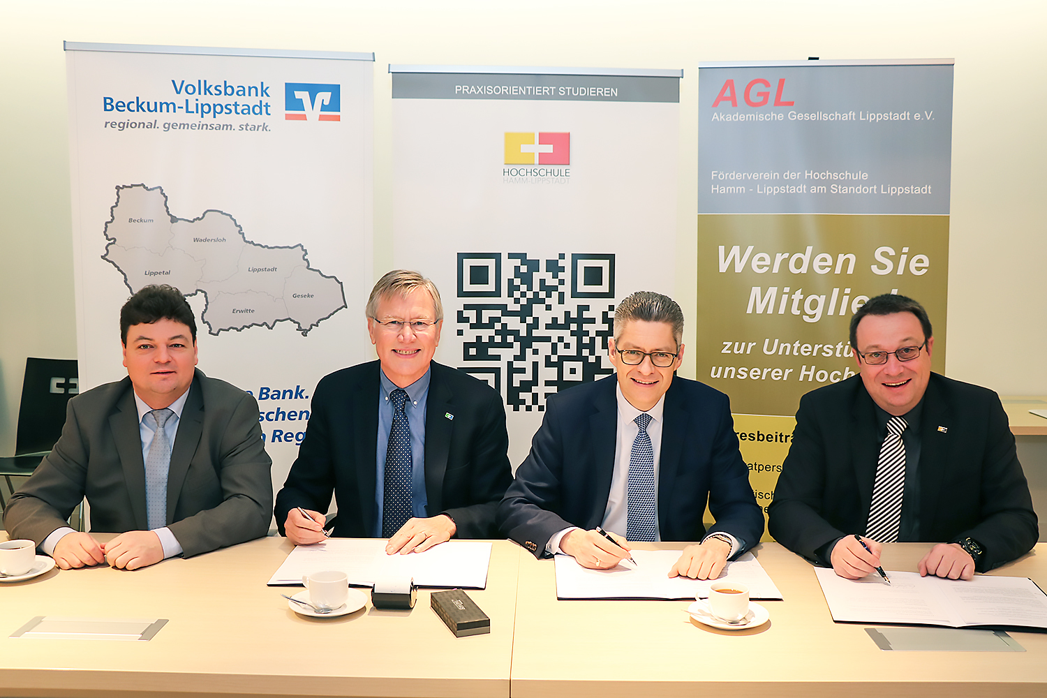 Junge Studierende mit Geschäftsideen in einem sehr frühen Stadium zu unterstützen, ist die Grundidee, der sich die Hochschule Hamm-Lippstadt, die Volksbank Beckum-Lippstadt eG und die Akademische Gesellschaft Lippstadt e.V. (AGL) verschrieben haben. Zusammen mit dem STARTERCENTER-Netzwerk, der IHK und der Fachhochschule Südwestfalen sowie den weiteren Volksbanken in der Region sollen zukünftig aussichtsreiche Gründungsideen mit einem Stipendium gefördert werden. Die entsprechende Kooperationsvereinbarung wurde am Mittwoch, 14. Dezember 2016 von den Beteiligten unterzeichnet.