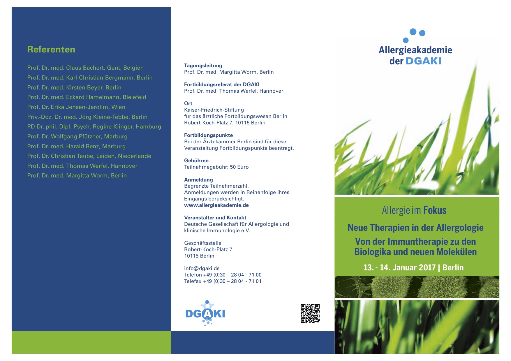 Die aktuellen Erkenntnisse werden interdisziplinär diskutiert. Wir erwarten so neue Impulse zum Verständnis und zum potentiellen Einsatz moderner Allergietherapien. Die Teilnehmerzahl ist begrenzt. Anmeldungen erfolgen direkt über die DGAKI-Website.