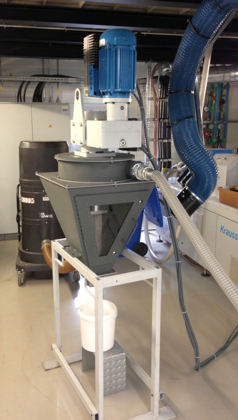 Schlüssel dabei ist ein am Fraunhofer PAZ entwickeltes und zum Patent angemeldetes Filterstopfwerk: Die Pappe als Ausgangsmaterial wird zunächst gemahlen, sodass einzelne Zellstofffasern in ausreichender Länge entstehen. Diese werden in einem Faser-Luft-Strom abtransportiert. Das Filterstopfwerk trennt dann die Fasern von der Luft und befördert sie in den Compoundier-Extruder, wo die Weiterverarbeitung stattfindet.
