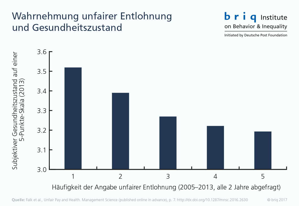 Die Größenordnung des negativen Gesundheitseffekts unfairer Entlohnung ist beträchtlich: Laut Studie entspricht er einer körperlichen Alterung um bis zu zehn Jahre oder einem Einkommensrückgang um monatlich mehr als 1.000 Euro netto. „Faire Bezahlung ist also nicht nur eine Frage der sozialen Gerechtigkeit und der Mitarbeitermotivation, sondern auch der Gesundheit. Dieser Aspekt wird in der politischen und öffentlichen Diskussion bislang vernachlässigt“, so Armin Falk.