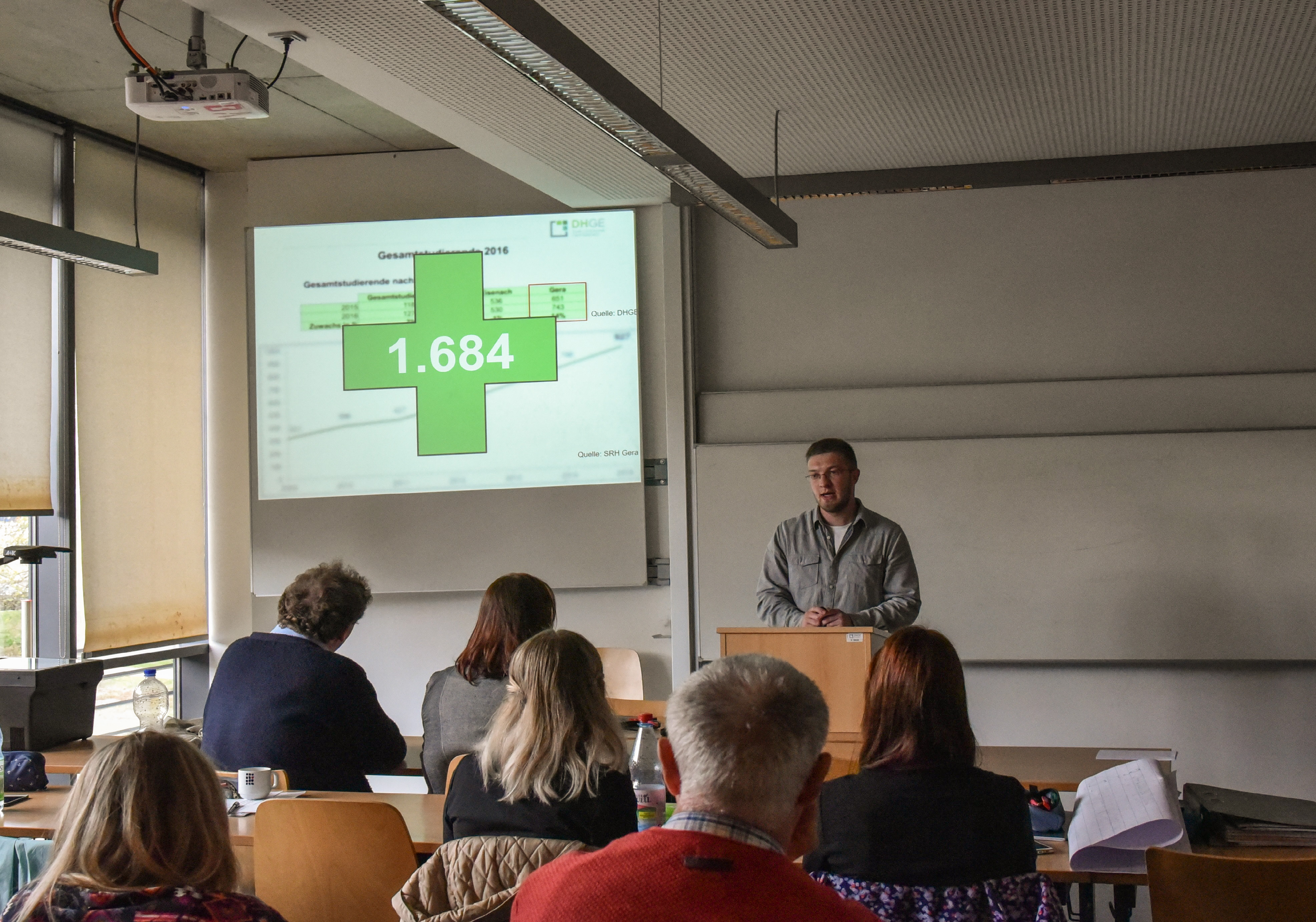Während eines Seminartages an der DHGE präsentierten die Studierenden ihre Arbeitsergebnisse, insbesondere ihre Reflektion und Einschätzung hinsichtlich der bereits vorhandenen Infrastruktur und Angebote in Gera. Zu Gast waren dabei Vertreter der Stadtverwaltung, welche sich auch intensiv an der dem Vortrag folgenden Diskussion beteiligten.