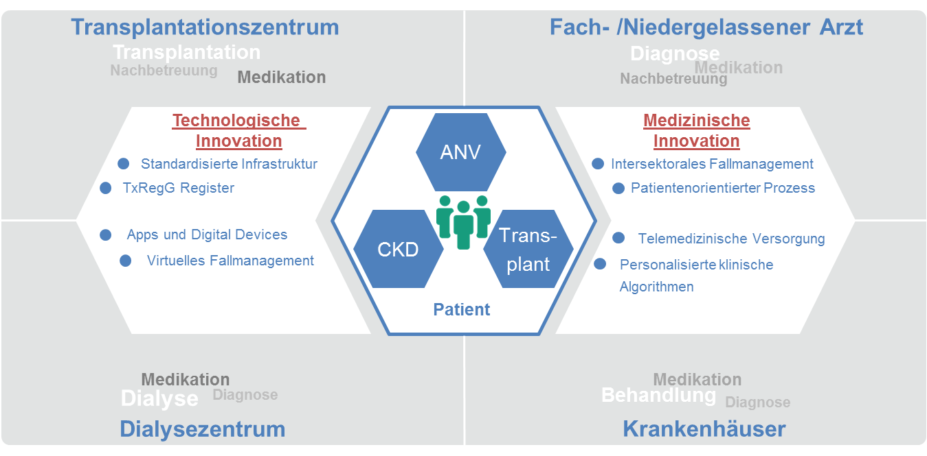 Das Konsortium erarbeitet ab 2017 erstmals in Deutschland eine Infrastruktur mit mehr als 150 Krankenhäusern und assoziierten nephrologischen Praxen in der Fläche. Im Fokus stehen Behandlungsprozesse, die über einen intelligenten und intersektoralen Austausch von Patientendaten, eine konsiliarische Mitbeurteilung von nierenkranken Patienten durch Spezialisten ermöglichen. Dadurch soll die Behandlung effektiver und effizienter werden.