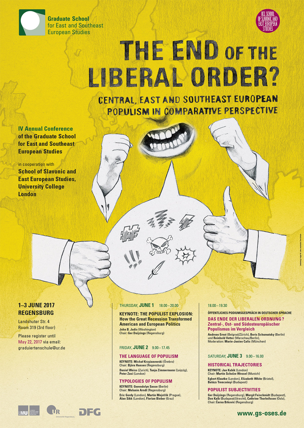 Die vierte Jahreskonferenz der Graduiertenschule für Ost- und Südosteuropastudien (GS OSES) wird sich vom 1. bis 3. Juni 2017 in Regensburg mit dem Phänomen des Populismus in Mittel-, Ost- und Südosteuropa beschäftigen. Die Tagung mit dem Titel „The End Of the Liberal Order? Central, East, and Southeast European Populism in Comparative Perspective“ findet in Kooperation mit der School of Slavonic and East European Studies des University College London (UCL SSEES) statt