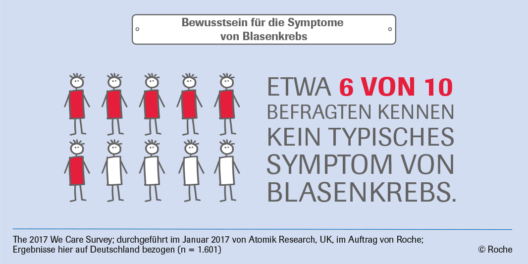 Eine aktuelle Umfrage, die anlässlich des Blasenkrebsmonats Mai durchgeführt wurde, zeigt: Blasenkrebs ist neun von zehn Befragten grundsätzlich bekannt – aber nur 40 Prozent können ein typisches Symptom der Erkrankung benennen. Gleichzeitig geben etwa 60 Prozent der Befragten an, mögliche Symptome von Blasenkrebs – das sind in erster Linie Blut im Urin, Schmerzen im Unterleib oder häufige Blasenreizungen – selbst bereits erlebt zu haben. Etwa jeder zehnte Betroffene gibt zudem an, diese Symptome zu ignorieren und keinen Arzt aufzusuchen.[2]