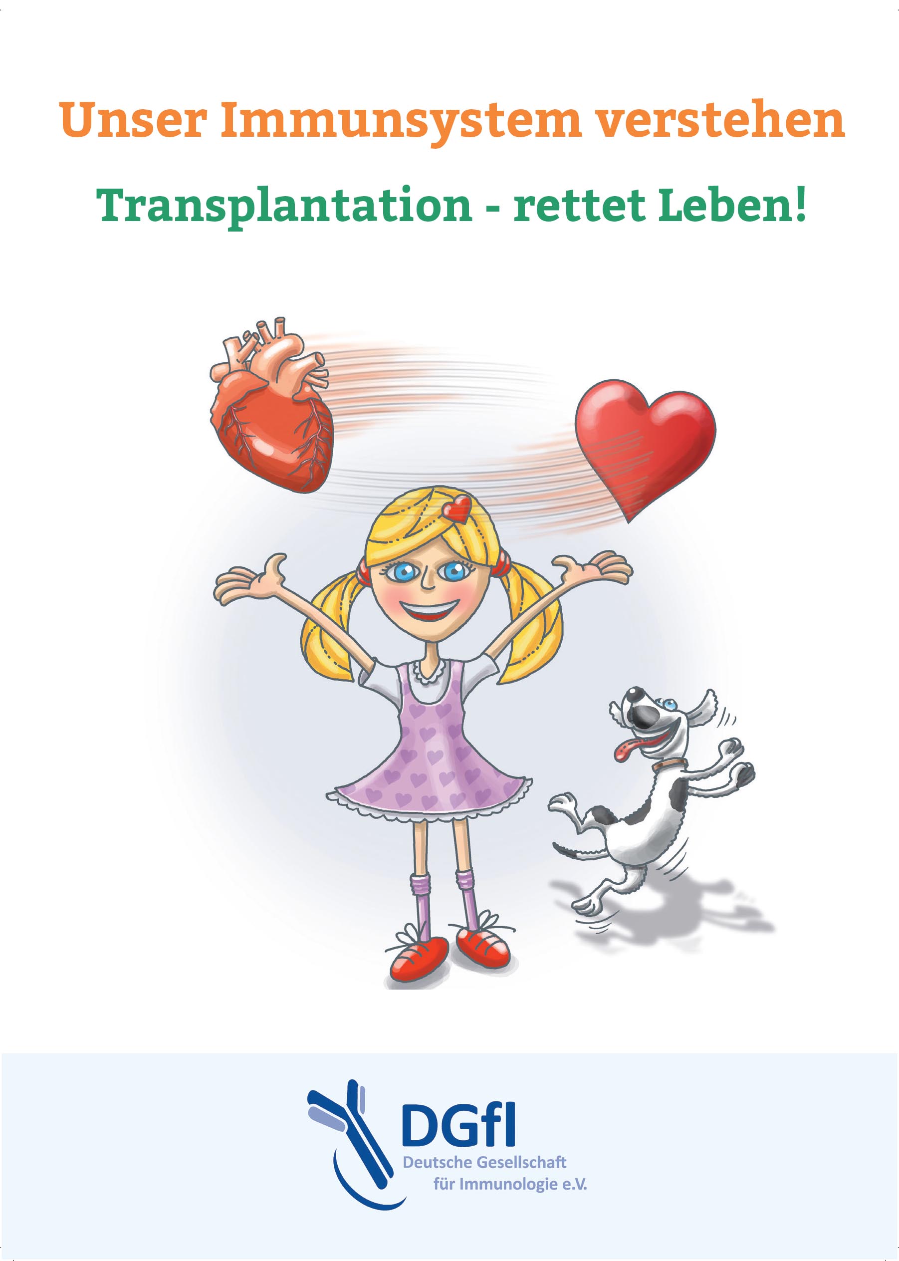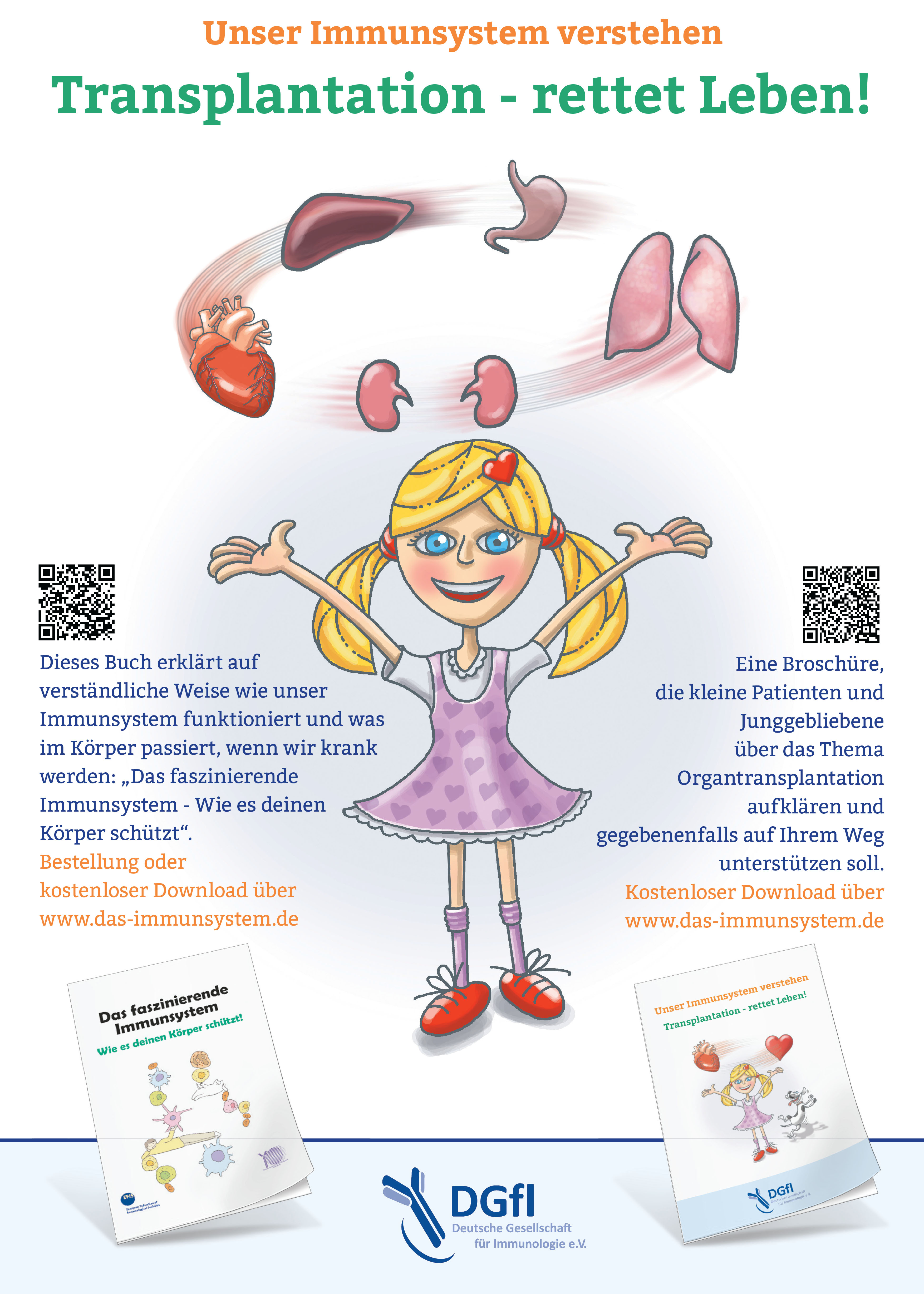 In Anlehnung an das bereits verlegte Buch „Das faszinierende Immunsystem“ (2011 erschienen) liegt der Deutschen Gesellschaft für Immunologie auch die Aufklärung zur Transplantation und Organspende am Herzen. Die hierfür eigens entworfene Broschüre soll kleine Patienten und Junggebliebene aufklären und sie ggf. auf Ihrem Weg unterstützen.