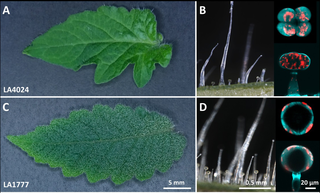 In addition to the analyses of trichomes and normal leaf cells, the trichome metabolism of cultivated and wild tomatoes was compared. Wild tomatoes produce far more and somewhat different secondary metabolites in their trichomes than their cultivated relatives. They form fewer and smaller fruits than cultivated tomatoes, but are much more resistant against insect damage. It appears that cultivated tomatoes have lost the genetic material that leads to the production of certain defense substances in the course of breeding aimed at selecting for yield. Comparing the collected data revealed initial indications of corresponding genes that are present in wild tomatoes but no longer found or less active in cultivated tomatoes. These genes for example encode certain carrier proteins internal to trichomes that permit the timely delivery of raw materials to the biosynthesis site.