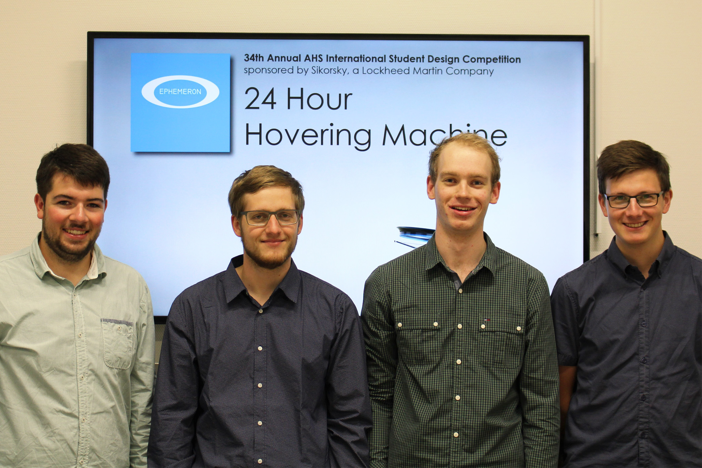 Bereits lange vor dem Studienabschluss haben vier Studenten des PFH Hansecampus Stade ihr ingenieurwissenschaftliches Können eindrucksvoll unter Beweis gestellt: Malte Blask, Hagen Hagens, Nick Neubert und Rouven Weg haben bei einem internationalen Wettbewerb der American Helicopter Society (AHS International) den zweiten Platz belegt. Ihre Aufgabe war es, eine Designstudie für ein helikopterähnliches Fluggerät zu entwickeln, das 24 Stunden an einem Punkt in der Luft fliegen kann.