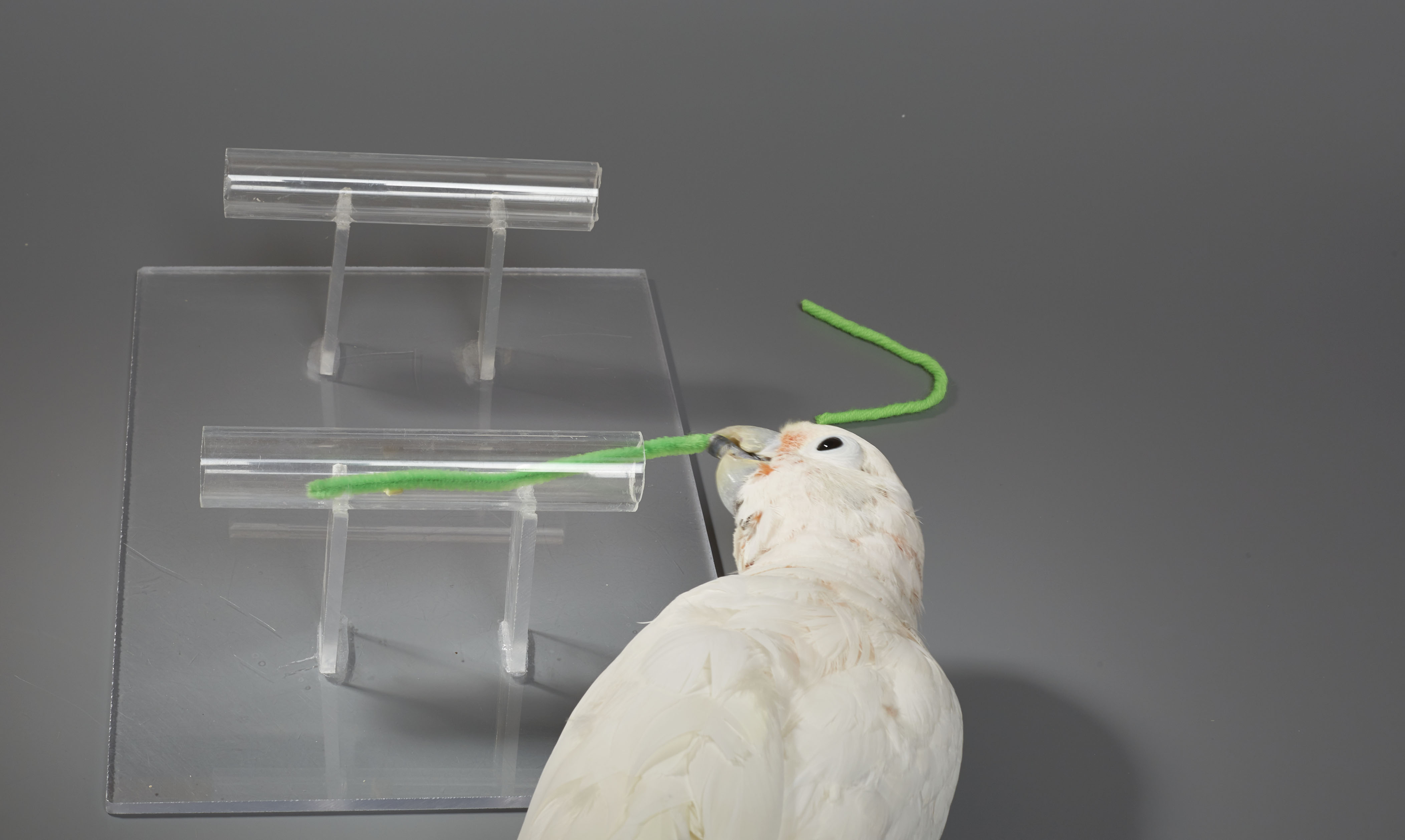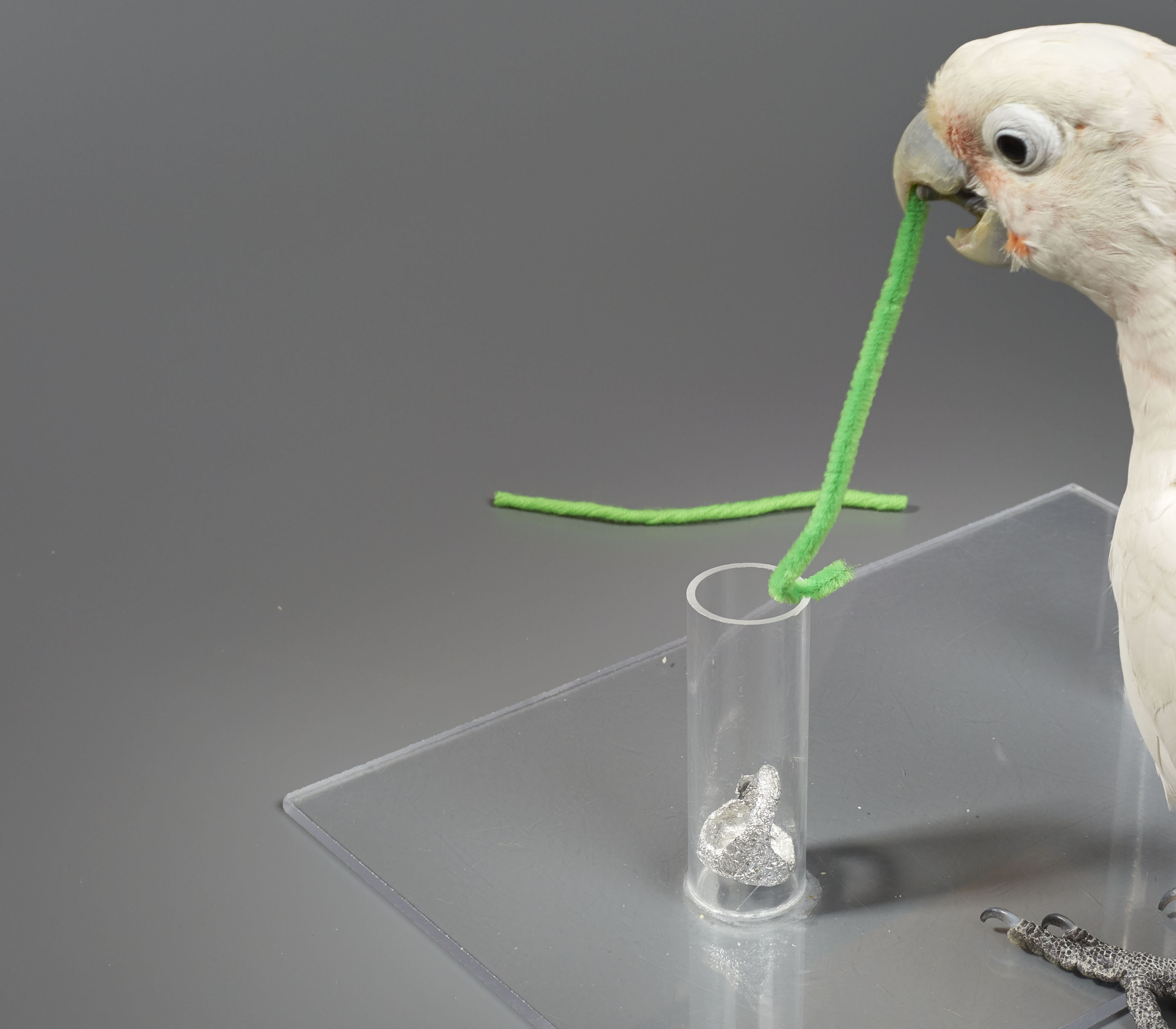 "Wir konfrontierten unsere Kakadus mit dem gleichen Problem wie Betty: Die Vögel erhielten ein mit einer Cashewnuss befülltes Körbchen am Boden eines vertikalen Plexiglasröhrchens und als einziges Hilfsmittel ein gerades Stück Draht. Um an den Inhalt des Körbchens zu gelangen, mussten die Tiere den Draht zu einem Haken verbiegen, das Werkzeug richtig herum einführen, den Haken in den Henkel einhängen und das Körbchen hochziehen", erklärt Isabelle Laumer, die die Studie im Rahmen ihrer Doktorarbeit am Goffin Lab in Niederösterreich durchführte.