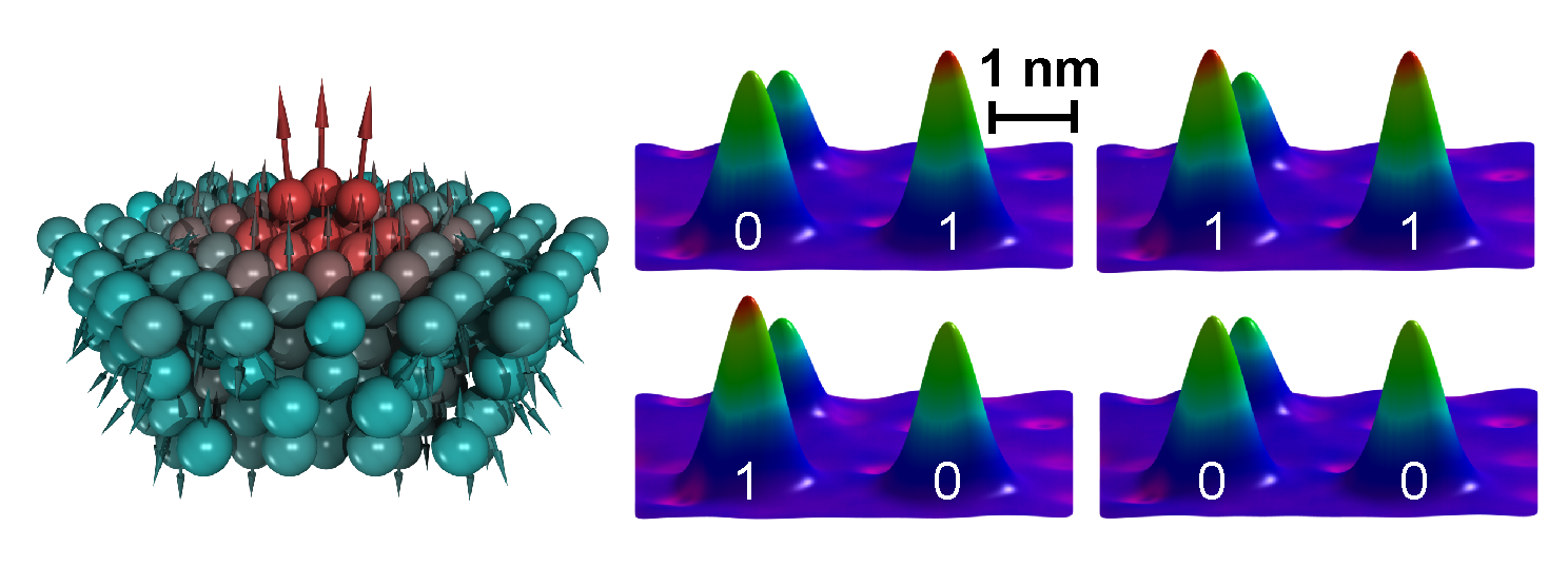 Abbildung: links: Darstellung des konstruierten magnetischen Bits aus nur drei Eisenatomen auf einer Platinoberfläche. Die Pfeile zeigen die eigentümliche Magnetisierungsstruktur innerhalb des Bits an. Rechts: Aufnahmen der Magnetisierung der vier möglichen Zustände des Registers, das aus zwei solcher magnetischen Bits besteht. In diesen Bildern zeigt die Höhe der beiden Bits ihren Zustand an (0: niedrig und 1: hoch). Das Eisenatom im Hintergrund dient als Marker für die Höhe eines Zehntel eines Nanometers.
