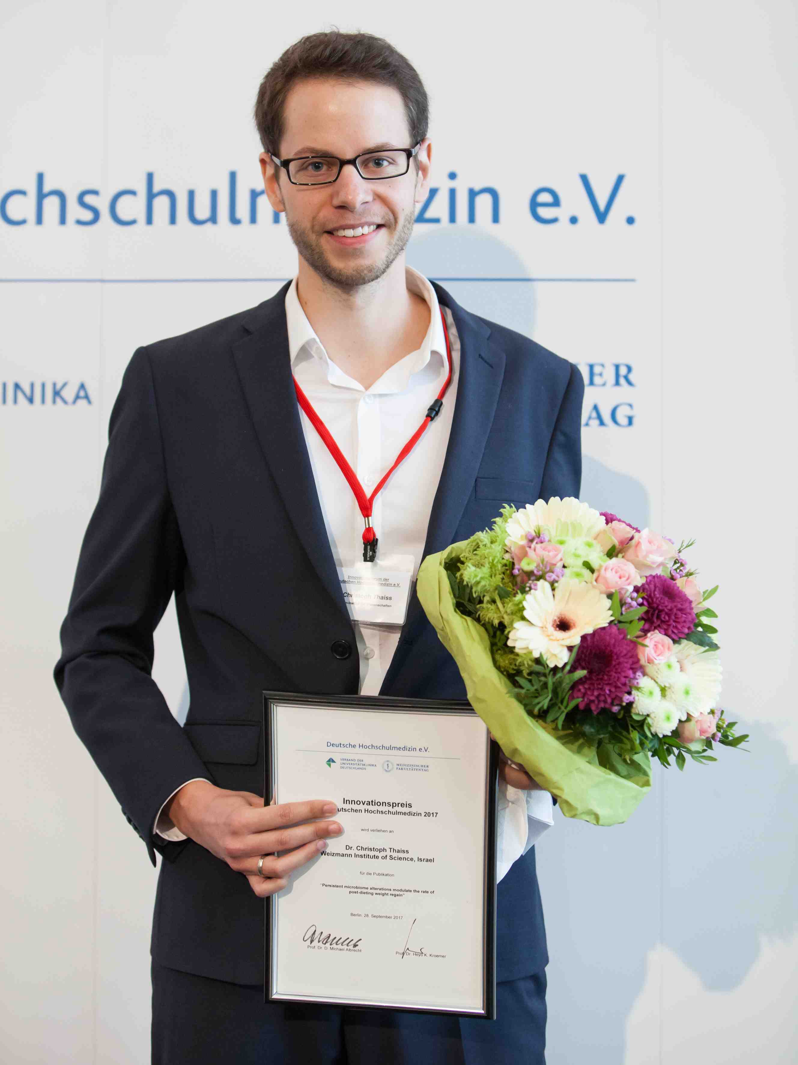 Für diese Forschungsarbeit erhielt Dr. Christoph Thaiss gestern im Rahmen des Innovationsforums den jährlich ausgelobten Innovationspreis der Deutschen Hochschulmedizin. Er soll zur Stärkung der Forschung in der Universitätsmedizin am Wissenschaftsstandort Deutschland beitragen.