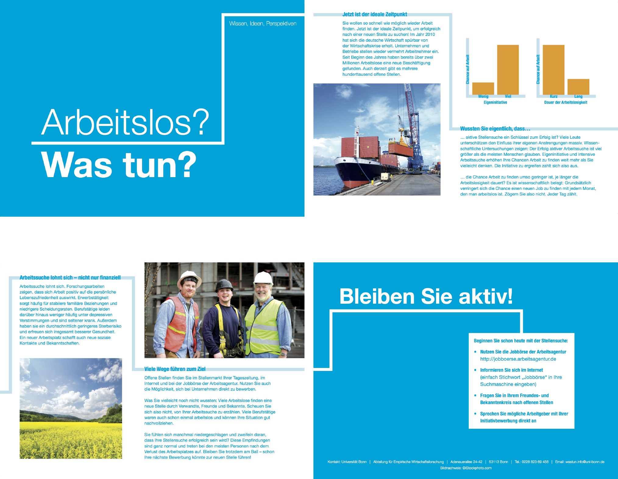 Die von dem Forscherteam entwickelte Broschüre zielt auf einen solchen „Nudge“ ab: Sie verweist in verständlicher Sprache auf die Bedeutung von Eigeninitiative bei der Stellensuche und betont die Wichtigkeit, sich aus möglichst vielen Quellen wie Tageszeitungen, Internet und Arbeitsagentur über offene Stellen zu informieren. Darüber hinaus wird darauf verwiesen, dass das persönliche Netzwerk aus Freunden, Verwandten und Bekannten einen wichtigen Beitrag zur erfolgreichen Stellensuche leisten kann.