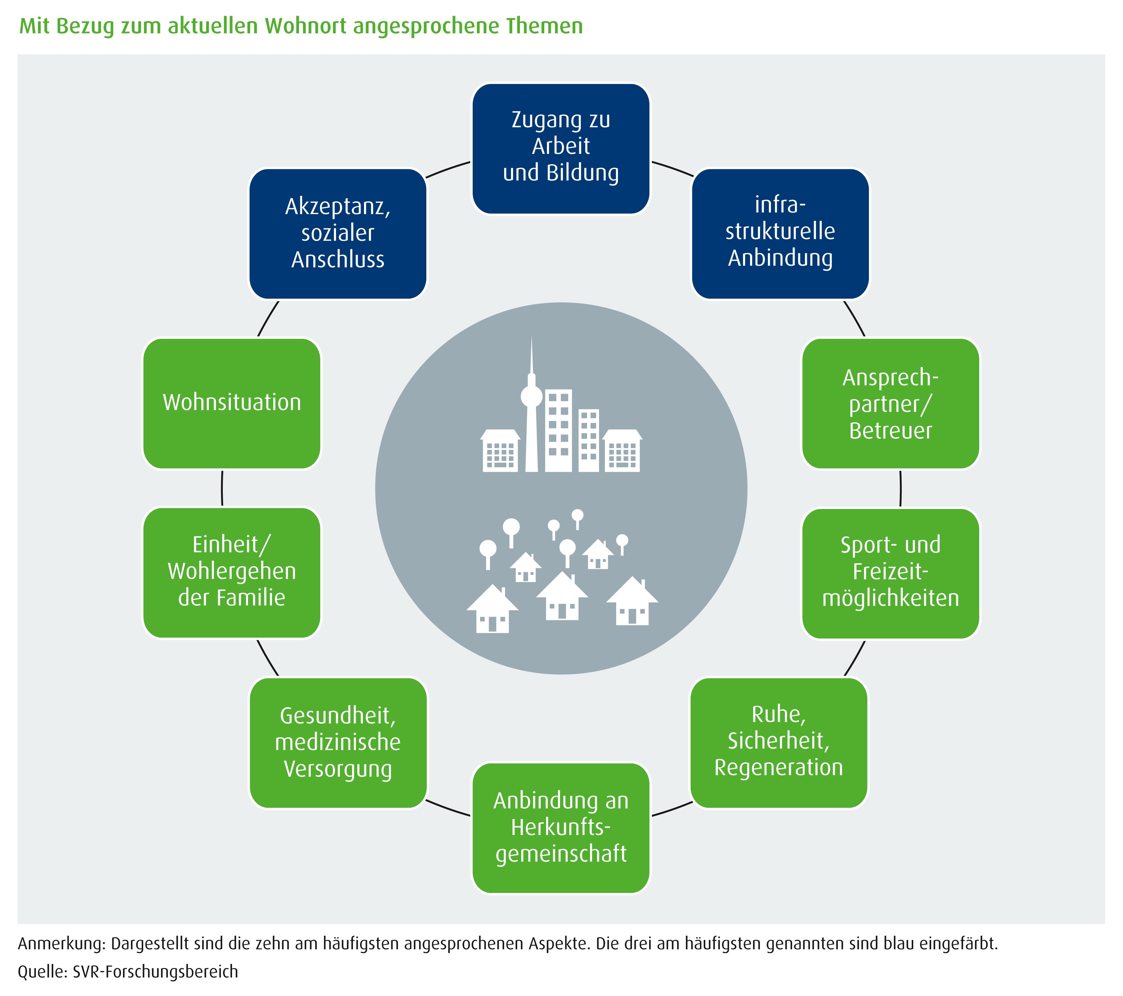 „Fast alle Neuankömmlinge wollen möglichst schnell arbeiten, um finanziell unabhängig zu sein. Gleichzeitig wollen sie sich aber auch qualifizieren oder weiterbilden“, so Dr. Jan Schneider, der Leiter des SVR-Forschungsbereichs. „Um dieses Spannungsfeld aufzulösen, braucht es flexible Strukturen. Die Maßnahmen, die den Zugang zu Arbeit, Ausbildung und gesellschaftlicher Teilhabe insgesamt fördern, müssen zu den individuellen Lebenslagen der Flüchtlinge passen. Sonst greifen sie nicht.“ Neben dem Zugang zu Arbeit und Bildung spielt es für die Integration auch eine Rolle, wie das lokale Umfeld aussieht: Flüchtlinge brauchen nicht nur Wohnraum, sondern auch zwischenmenschliche Begegnungen und Kontakte. „Wenn die Bedingungen stimmen, würden viele auch gerne in kleineren Kommunen und in ländlichen Räumen bleiben“, hebt Dr. Schneider ein Ergebnis der Studie hervor. „Die Städte und Gemeinden tragen eine hohe Verantwortung: Sie sind der Motor für die gesellschaftliche Teilhabe von Flüchtlingen.“