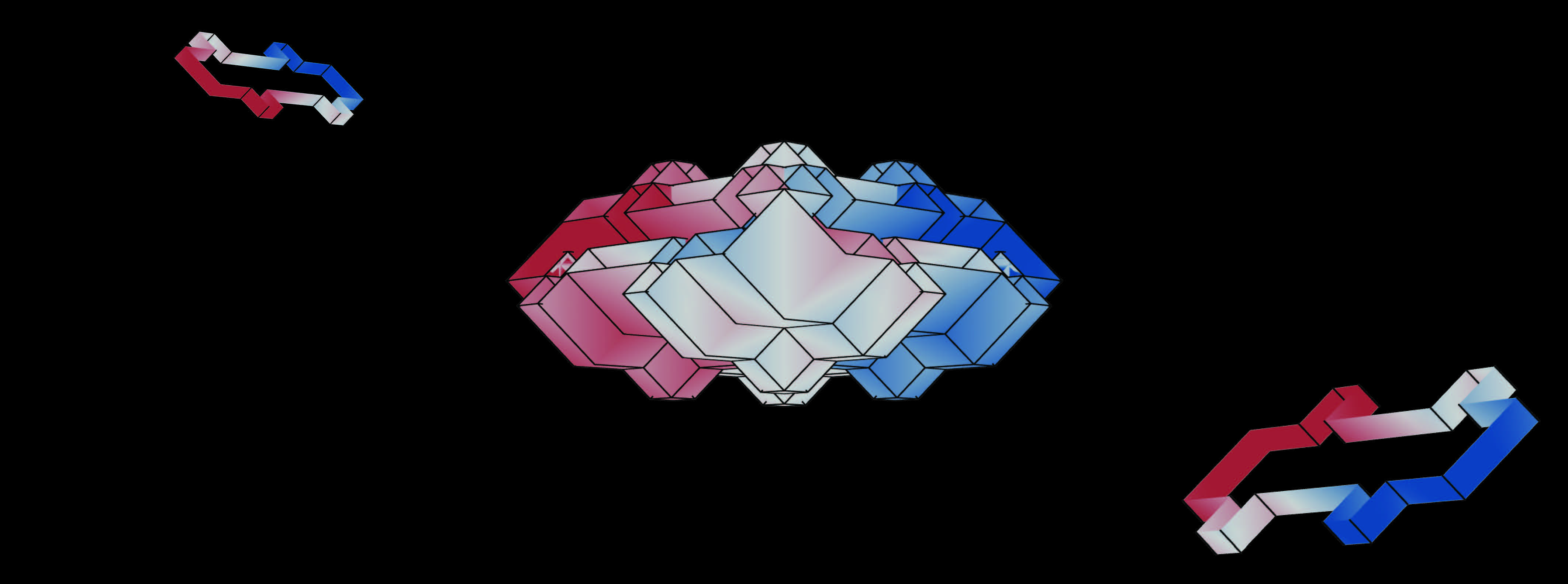 Illustration einer hypothetischen Probe für die Untersuchung des Quanten-Hall-Effekts in einem 4D System. Zwei zweidimensionale sogenannte Hall-Bars (links/rechts) – die Geometrie, die Klaus von Klitzing in seinem ersten Experiment verwandte – werden in orthogonalen Subräumen kombiniert, um ein 4D Quanten-Hall-System zu bilden (Mitte). Diese 4D Probe wird hier veranschaulicht, indem die vierte Dimension in der Farbe einer Oberfläche in drei Dimensionen dargestellt wird, wobei Rot die positiven und Blau die negativen Werte anzeigt. (Grafik: LMU/MPQ)