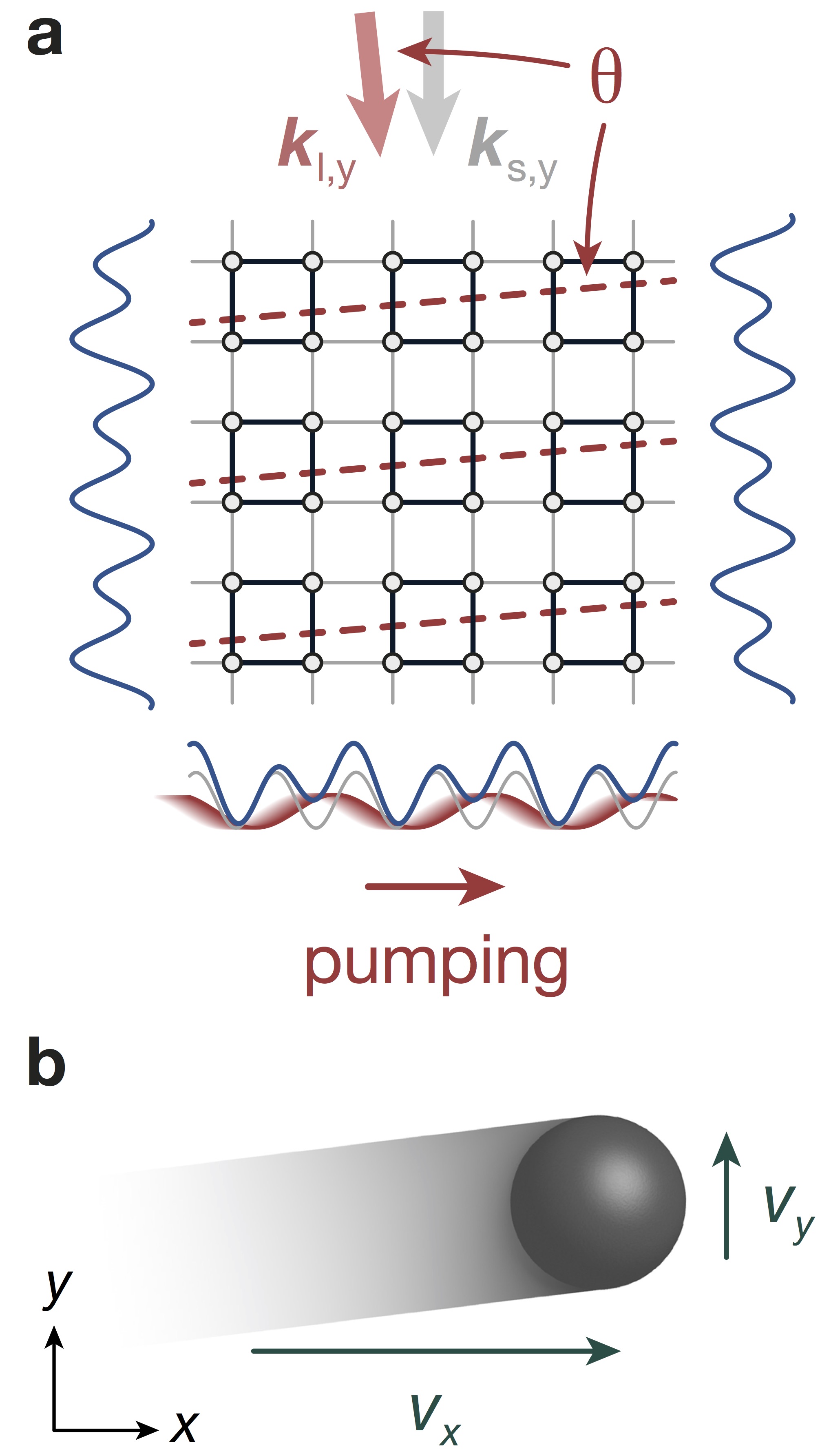 2D toplogische Ladungspumpe in einem optischen Übergitter. (a) Das Übergitterpotential wird durch Interferenz von Laserstrahlen erzeugt, die einen Lichtkristall bilden. Dieser ähnelt einem Eierkarton, in dem die Atome plaziert werden. (b) Eine in der Zeit periodische Modulation der horizontalen x-Achse ruft eine Bewegung der Atome im Gitter hervor. Die schnelle Bewegung entlang der x-Achse entspricht dem 2D Quanten-Hall-Effekt, während die leichte Drift in der transversalen y-Richtung die Existenz des 4D Quanten-Hall-Effekts offenbart. (Grafik: LMU/MPQ)