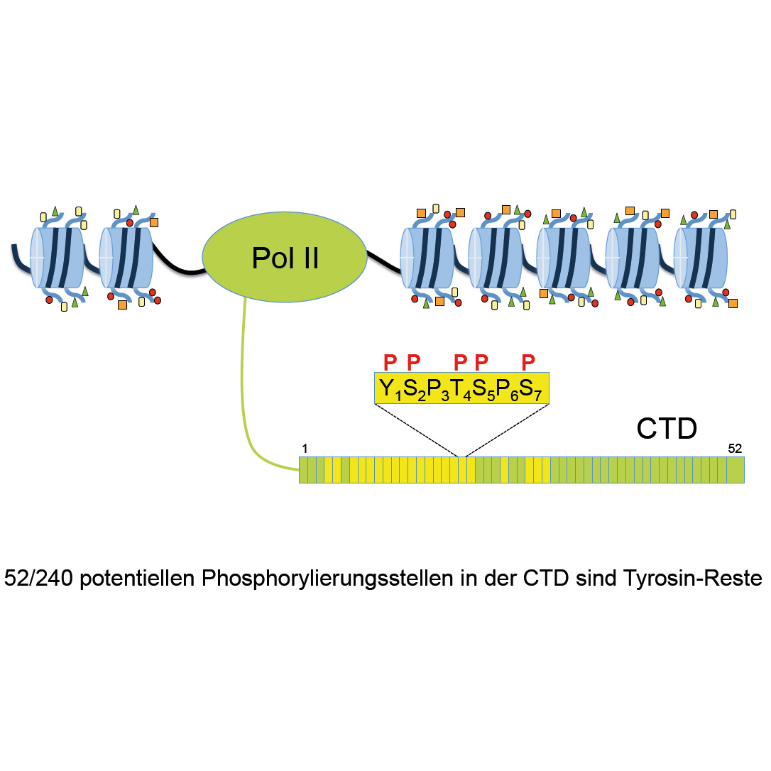 Das Enzym RNA Polymerase II, kurz Pol II, ist verantwortlich für die Transkription (Abschrift eines Genabschnittes). Die Inhalte in unserem Erbgut sind eigentlich stumm (das heißt inaktiv) und müssen erst mit Hilfe des Enzyms Pol II in RNA übersetzt werden. Damit das Enzym nicht zufällig arbeitet, ist der Beginn und das Beenden der Transkription streng reguliert. Diese Regulation passiert durch die dynamische Modifikation der Pol II an ihrer carboxy-terminalen Domäne (CTD). Die CTD enthält unter anderem 52 Tyrosin-Reste, die während der Transkription phosphoryliert werden können.