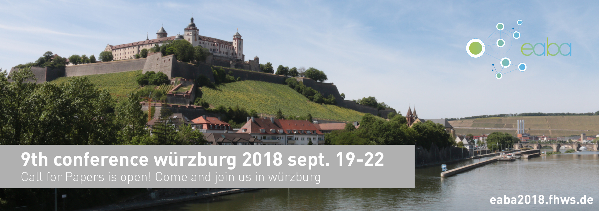 Für die Konferenz wurde eine Homepage eingerichtet unter https://eaba2018.fhws.de. Ab sofort ist der „Call for Papers“ eröffnet. Alle Interessierten sind aufgerufen, Beiträge zur Konferenz einzureichen - für einen Eindruck bezüglich des Themenspektrums dieser Konferenz vgl. das Programm der letzten EABA-Konferenz (http://www.europeanaba.org/assets/Uploads/COMPLETE-PROGRAM-EABA-2.pdf). Für Rückfragen steht Professor Dr. Christoph Bördlein von der Fakultät für Angewandte Sozialwissenschaften der FHWS, derzeit auch Secretary im Vorstand der EABA, gerne zur Verfügung (secretary@europeanaba.org).
