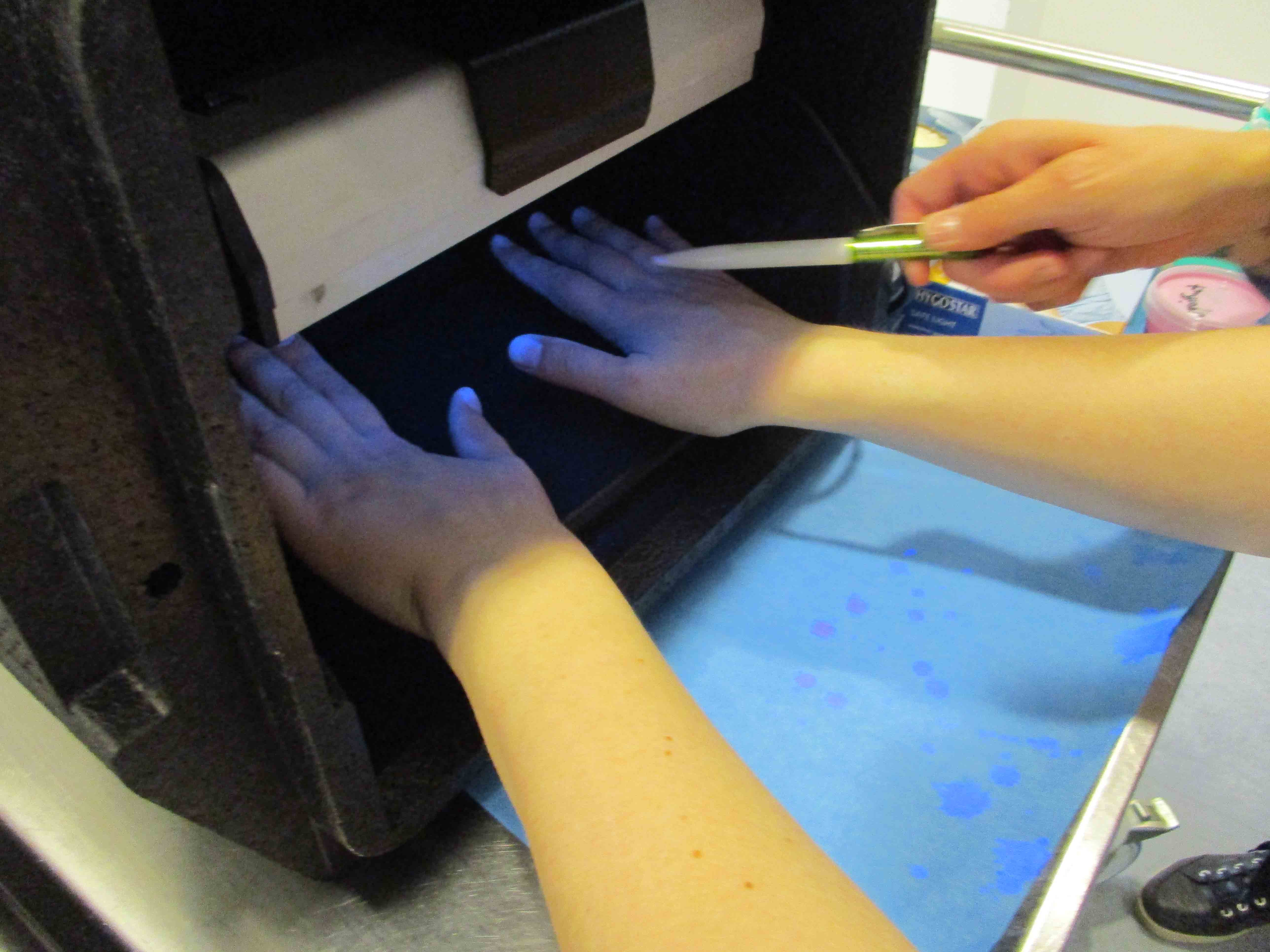 „Es geht darum, die Beschäftigten vor Ort mit Aktionen und Schulungen ‚abzuholen‘. Dies geschieht zum Beispiel mithilfe einer UV-Lampe, mit der an den Händen sichtbar gemacht wird, ob die Desinfektion korrekt durchgeführt und somit die Hände komplett desinfiziert wurden. So macht Hygiene auch Spaß“, sagt Dr. Katharina Zell, Assistenzärztin der Sektion Krankenhaushygiene. „Angewiesen sind wir auch auf die Unterstützung der Besucherinnen und Besucher. Indem sie sich ebenfalls korrekt die Hände desinfizieren, tragen sie keine Keime zu den Patienten. Denn bereits Krankheitserreger, die einem gesunden Menschen nichts ausmachen, können bei einem Patienten zu weiteren Infektionen führen, die den Heilungsprozess verzögern.“