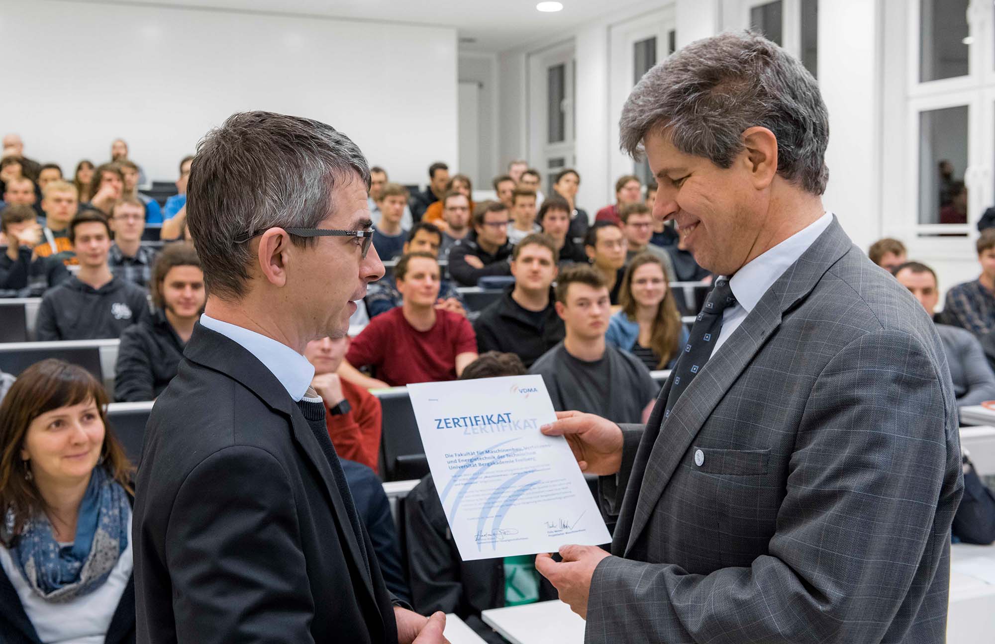 Gemeinsam mit dem Verband Deutscher Maschinen- und Anlagenbau (VDMA) setzt sich die TU Freiberg im Maschinenhaus-Transferprojekt für mehr Studienerfolg in den Ingenieurwissenschaften ein. Zum Projektabschluss am 9. Januar wurde die Universität für ihr Engagement in Studium und Lehre mit dem „Maschinenhaus-Zertifikat" ausgezeichnet und als 42. Hochschule in den Kreis der Maschinenhaus-Transferhochschulen aufgenommen.