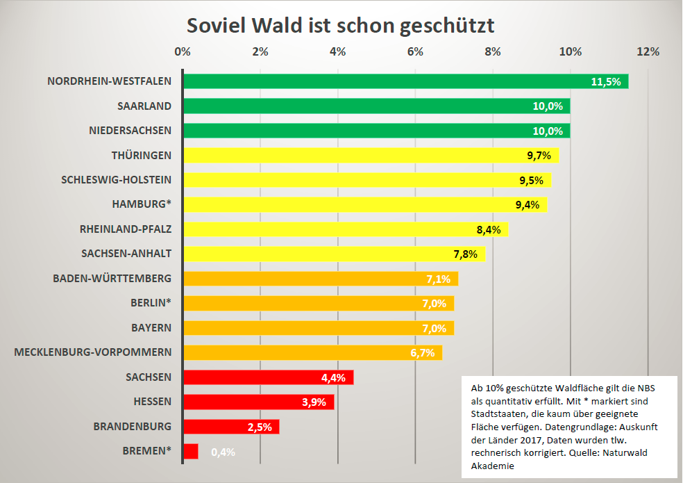 Das Ranking ist das Ergebnisse einer Befragung der Naturwald Akademie aller zuständigen Landesministerien im Zeitraum Sommer-Herbst 2017. Dabei ist die Qualität der gelieferten Daten sehr unterschiedlich. Einige Länder legen aktuelle Daten vor. Andere verwenden lediglich Zahlen aus der Bundeswaldinventur von 2012 oder datieren diese als aktuell um. Hinzu kommt in den Ländern eine ohnehin unklare Datenlage, da es zwischen der zweiten und dritten Bundeswaldinventur Änderungen in den Erhebungsmethoden gab.