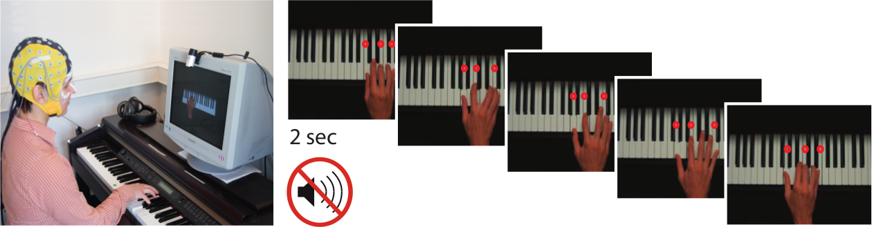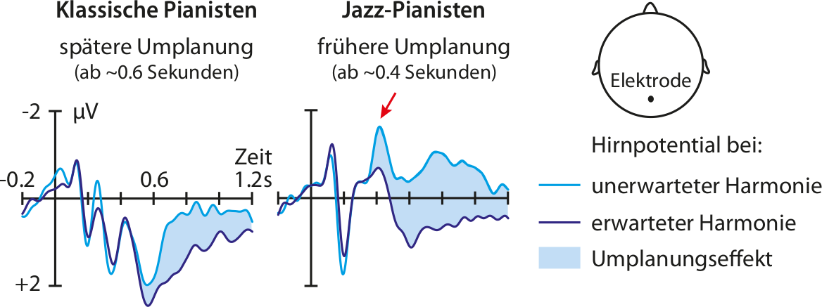 Untersucht haben die Wissenschaftler am MPI CBS diese Zusammenhänge mithilfe von 30 professionellen Pianisten, eine Hälfte davon seit mindestens zwei Jahren spezialisiert auf Jazz, die andere auf klassische Musik. Diese bekamen auf einem Bildschirm eine Hand zu sehen, die eine Abfolge von Akkorden auf einem Klavier spielte, gespickt mit gezielten Stolperfallen in den Harmonien und den Fingersätzen. Die Profi-Pianisten sollten es ihr nachtun und entsprechend flexibel auch auf die Unregelmäßigkeiten reagieren, während ihre Hirnsignale mit EEG-Sensoren auf ihrem Kopf erfasst wurden. Um dabei Störsignale wie akustische Signale auszuschließen, lief das Ganze vollkommen ohne Töne, als stummes Klavierspiel ab.