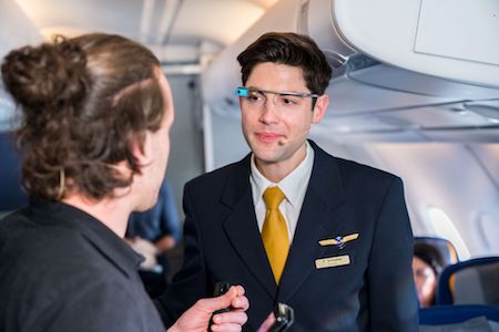 Mit „LYRA“ präsentierten die DFKI-Wissenschaftler Orkhan Amiraslanov und Bo Zhou vom Forschungsbereich Eingebettete Intelligenz eine Anwendung zur Verbesserung der Kommunikation zwischen Passagieren und der Kabinencrew. Die gemeinsam mit der LMU München und der Universität Duisburg-Essen sowie Xnet Communications aus Hamburg entwickelte Web-Applikation „LYRA Connect“ verkürzt die Laufwege des Kabinenpersonals und optimiert damit die Service-Abläufe und den individuellen Service an Bord. Fluggäste können mit ihren eigenen Mobilgeräten einfache Anfragen an das Flugpersonal senden. So können Passagiere beispielsweise ein Getränk bestellen oder fragen, ob der Anschlussflug noch erreicht wird. Der nächste verfügbare Flugbegleiter hat die Anfrage durch Smart Glasses direkt vor Augen, und weiß sofort, wer wann was bestellt oder gefragt hat. Dabei können die Flugbegleiter auch zusätzliche Informationen über die Passagiere abfragen. Dazu stellen sie sich auf ein Signalfeld, ein „Location Beacon“, das vor jedem Sitz angebracht ist. LYRA spielt dann die entsprechende Information diskret auf die Smart Glasses für den Flugbegleiter ein. So lässt sich beispielsweise vorab erfahren, welche Sprache der Passagier spricht oder welche Speisepräferenzen er angegeben hat.