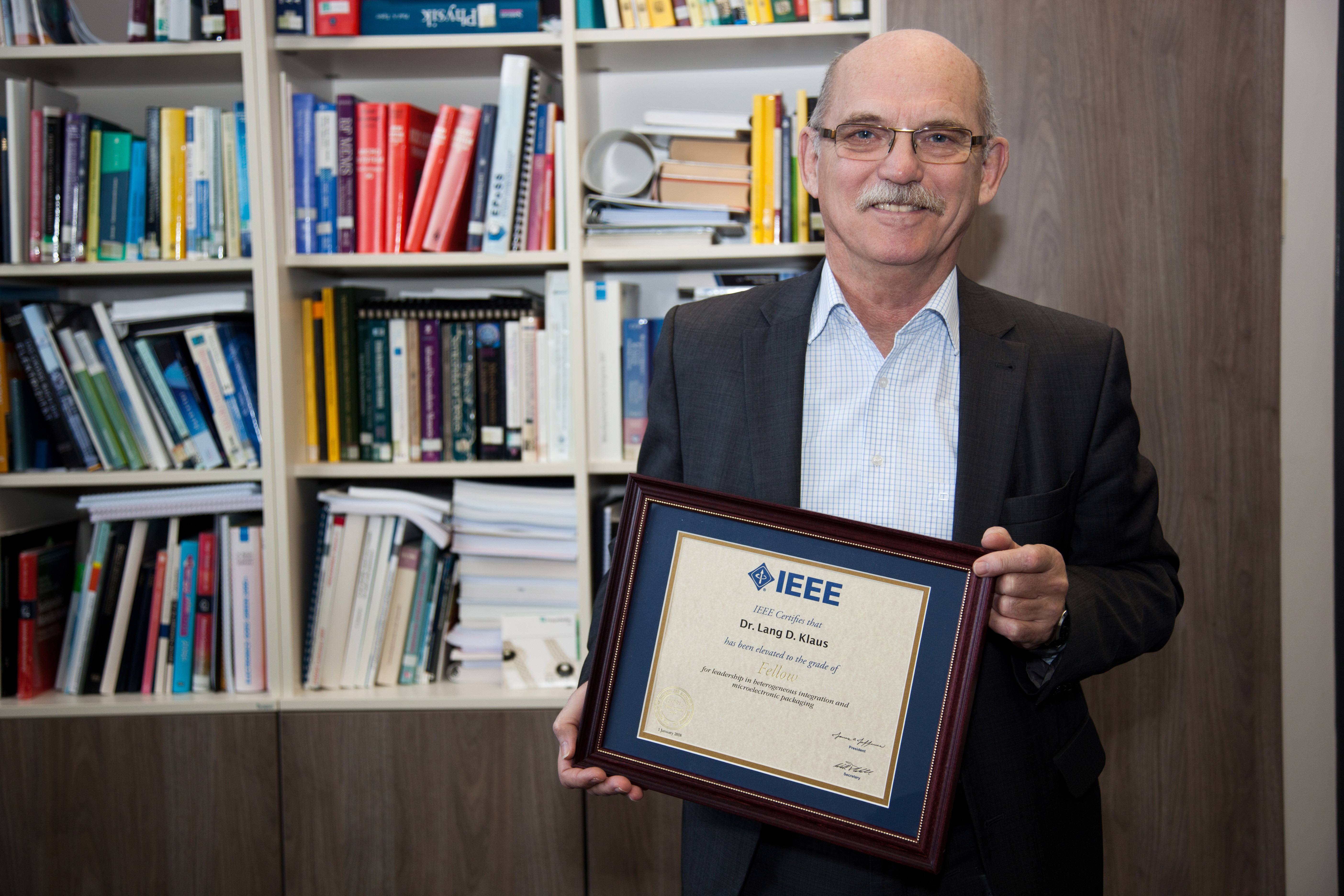 Zum Jahresbeginn 2018 wurde Prof. Dr.-Ing. Dr. sc. techn. Klaus-Dieter Lang vom Institute of Electrical and Electronics Engineers (IEEE) mit dem Fellow Grade ausgezeichnet. Damit würdigt die größte Ingenieursvereinigung der Welt Professor Langs langjährige führende und herausragende Leistungen im Packaging und der heterogenen Integration von Mikroelektronik. Lang, der von 2008-2014 das deutsche Chapter einer IEEE-Fachgesellschaft – der jetzigen Electronics Packaging Society (EPS) – leitete, treibt durch fachliche Beiträge und internationale Vernetzungsaktivitäten die erfolgreiche Entwicklung der IEEE maßgeblich voran.