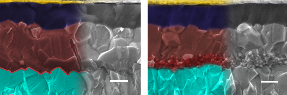 Die Wissenschaftler untersuchten zwei unterschiedliche Architekturen von Perowskit-Solarzellen, die ansonsten auf identische Weise präpariert wurden. In beiden grenzt die Perowskit-Dünnschicht an eine elektronenleitende Schicht aus einem Metalloxid wie Titandioxid oder Zinndioxid. Während in der ersten Variante die beiden Schichten glatt aneinandergrenzen (planare Grenzschicht), bildet sich in der zweiten Variante eine mesoporöse Zwischenschicht aus Perowskit und Metalloxid aus, die eine komplexe, schwammartige Struktur mit vielen winzigen Poren besitzt. Überraschenderweise blieb der Wirkungsgrad von Zellen mit dieser mesoporösen Zwischenschicht weitaus länger stabil als in Zellen mit einer planaren Zwischenschicht.
