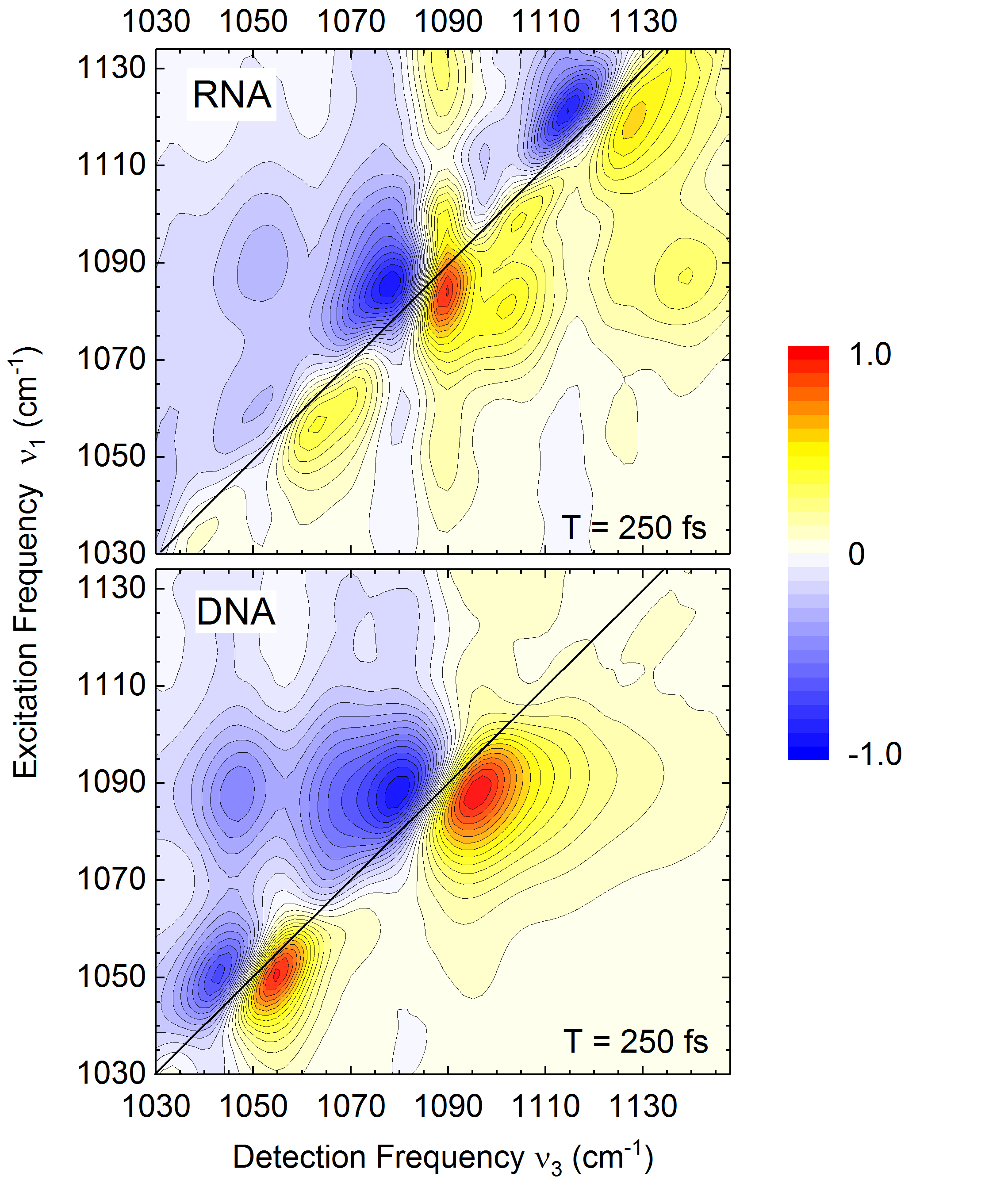 Fig. 2: Two-dimensional vibrational spectra of RNA (upper panel) and DNA (lower panel) in the frequency range of the sugar-phosphate vibrations of the backbone. The RNA spectrum displays additional bands (contours) along the frequency diagonal ν1=ν3 and a more complex distribution of off-diagonal peaks. In addition to the frequency positions the line shapes of the individual bands (contours) give insight in details of the interactions with neighboring water molecules.