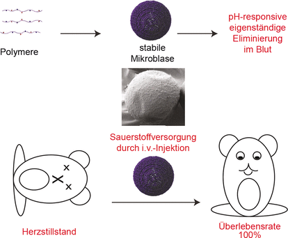 Werden die Mikrobläschen in Blut gegeben, liegen die Säuregruppen aufgrund des pH-Wertes als geladene Carboxylat-Gruppen vor. Nun kann Wasser eindringen und der Sauerstoff austreten. Die elektrostatische Abstoßung zwischen den Ladungen lässt die Schalen auseinanderfallen und die Bestandteile lösen sich vollständig auf.