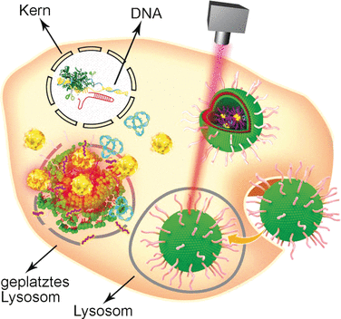 Im Jahr 2002 wurde mit den CRISPR-Cas-Systemen, die aus Protein und RNA bestehen, eine besondere Verteidigungsstrategie von Bakterien gegen Viren entdeckt. Dieses System wurde zu einer der wichtigsten genmanipulativen Methoden in der Molekularbiologie und Biomedizin weiterentwickelt. Mit dem CRISPR-Cas9-System können Molekularbiologen ein Gen im eukaryotischen Zellgenom verhältnismäßig einfach verändern, auschalten oder einfügen. Ein Schwachpunkt ist jedoch die schiere Größe des Systems. Viren kann man daher nicht als Transportmittel verwenden, um das große, das CRISPR-Cas9-System kodierende Plasmid in die Tumorzellen und dann in den Zellkern zu bringen. Wenfu Zheng und seine Kollegen vom National Center for NanoScience and Technology in Beijing (China) haben nun in Zusammenarbeit mit Forschern aus Japan und China ein multifunktionales Transportmittel aus Lipid-modifizierten Goldnanopartikeln entwickelt. Tests zeigten, dass dieses molekulare Vehikel das CRISPR-Cas9-System effektiv in Tumore bringt und dort freisetzt. In den Tumorzellen wird es durch Laserlicht zersetzt, und die CRISPR-Cas9-Gen-Editing-Maschinerie wird aktiviert. Durch Ausschaltung eines funktionswichtigen Zielgens wurden Tumorzellen in den programmierten Zelltod geführt, und das Wachstum des Tumors wurde gestoppt.