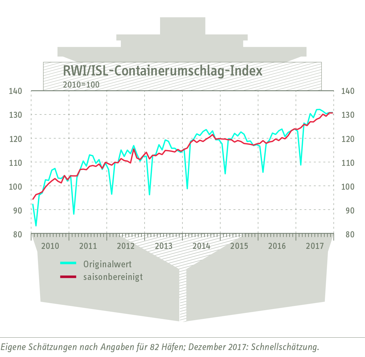 Der Containerumschlag-Index des RWI – Leibniz-Institut für Wirtschaftsforschung und des Instituts für Seeverkehrswirtschaft und Logistik (ISL) verharrte im Dezember 2017 auf dem im November erreichten hohen Niveau von (revidiert) 130,6. Damit verabschiedet sich der Index freundlich aus dem Jahr 2017.