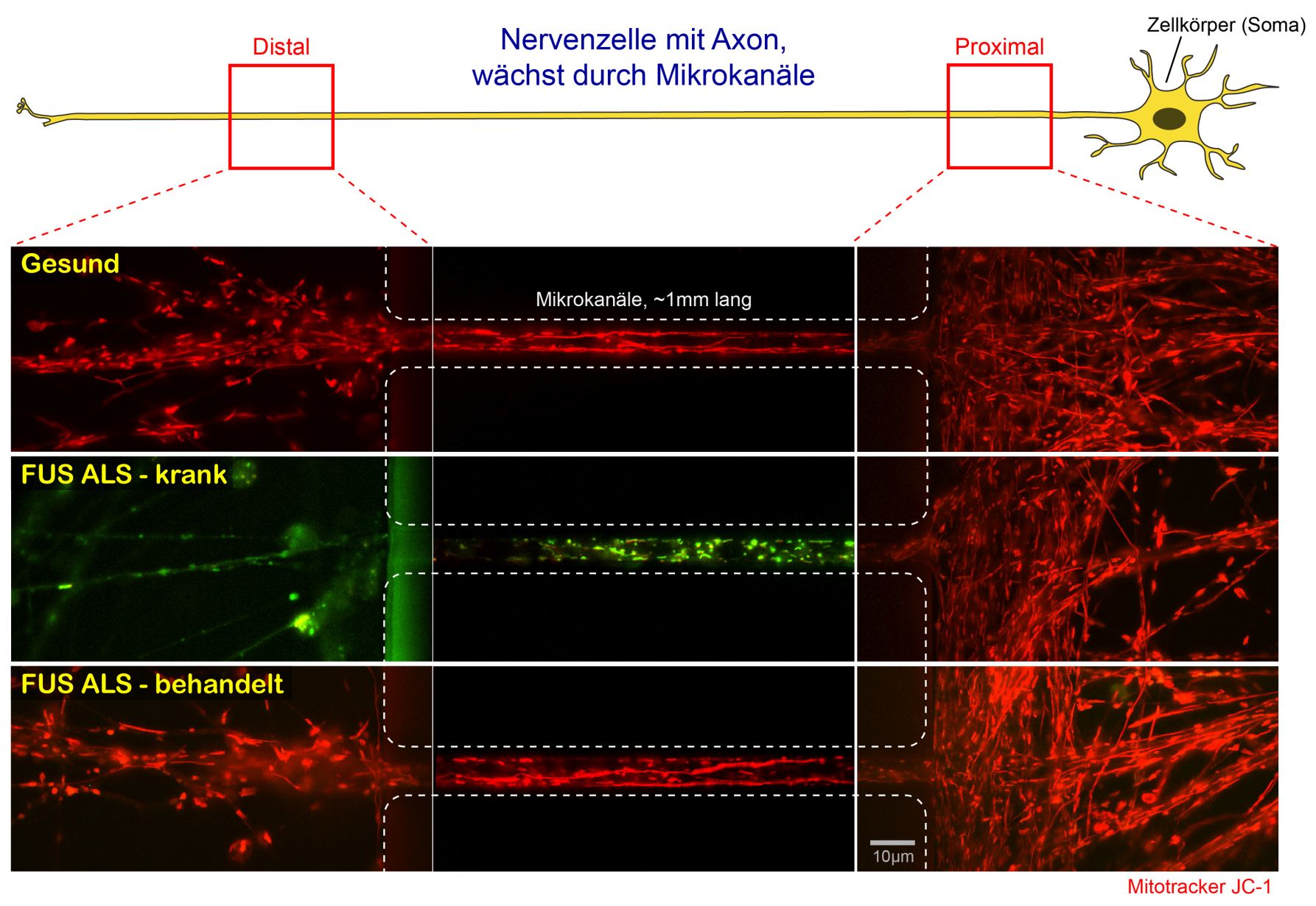 Nervenzellen von Patienten bilden in Kultur Fortsätze, sogenannte Dendriten und Axone. Die Axone wachsen proximal (rechts) in Mikrokanäle hinein und sprießen am distalen Ende (links) wieder heraus. Im Dunkelfeld des Videomikroskops können nun durch den speziellen Fluoreszenzfarbstoff JC-1 die Kraftwerke der Zelle, die sogenannten Mitochondrien, sichtbar gemacht und ihr axonaler Transport durch die Mikrokanäle verfolgt werden. Durch das Übereinanderlagern aller Einzelaufnahmen des Videos werden die Bewegungen der Mitochondrien durch langgezogene rote Bahnenlinien dargestellt (sogenannte maximum intensity projection).
