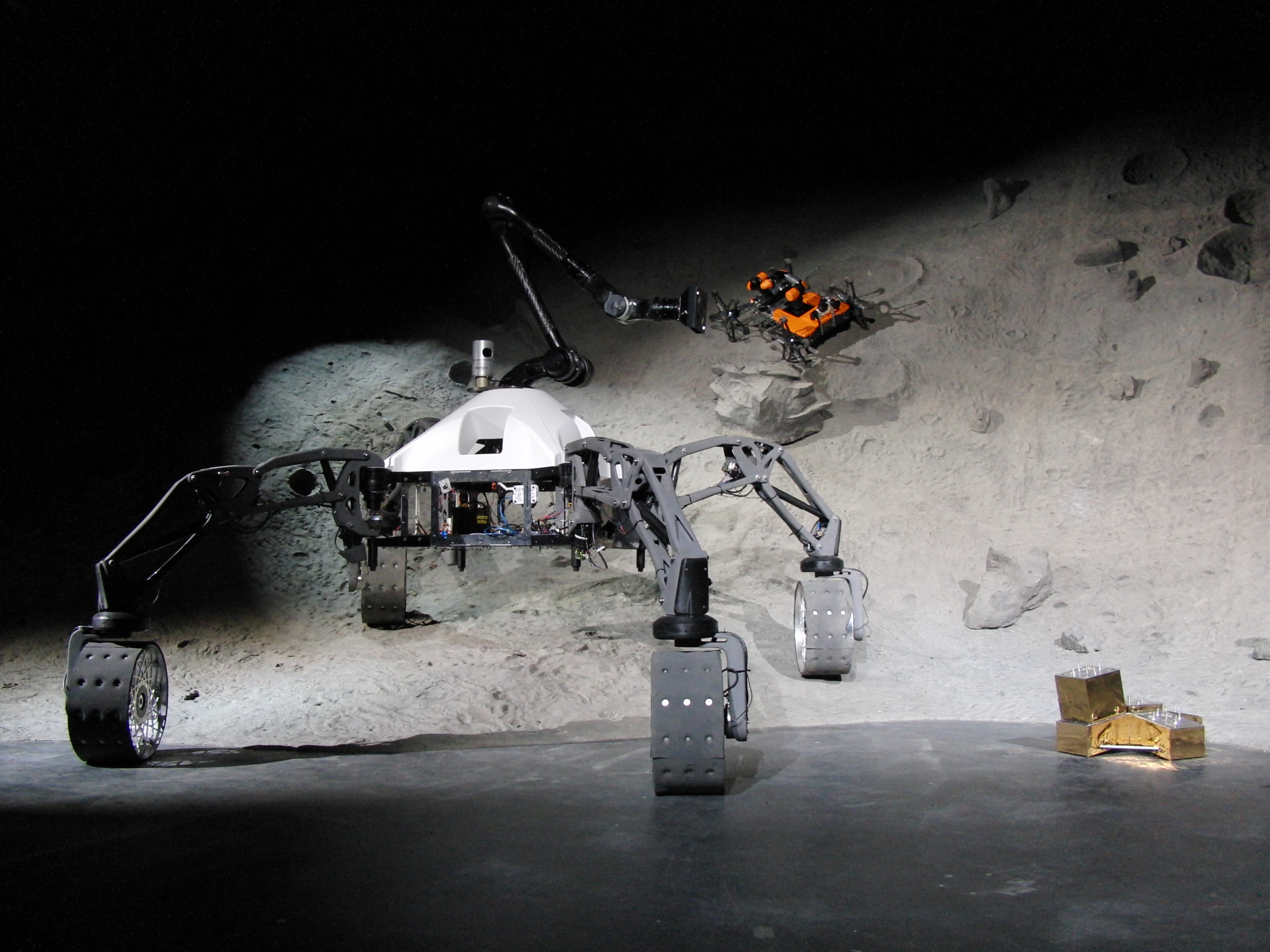 Im Weltraummissionsszenario demonstrierten die Wissenschaftler, wie ein aus mehreren mobilen und immobilen Systemen bestehendes robotisches Team eine logistische Kette bildet, um autonom einen fremden Planeten zu erkunden. Teil dieses Teams sind die beiden Rover SherpaTT und Coyote III sowie stationäre Messstationen und Versorgungsdepots in Form sogenannter BaseCamps, die u.a. dem Datenaustausch und der Energieversorgung dienen. Alle Systeme sind mit einer oder mehreren standardisierten elektromechanischen Schnittstellen ausgerüstet, die je nach Aufgabe das Andocken zusätzlicher Funktionsmodule sowie den Transport der immobilen Einheiten durch die Rover ermöglichen. Der Mensch kann in die Mission über eine innovative Mensch-Maschine-Schnittstelle von der Erde aus eingreifen. Dafür setzen die Forscher eine sogenannte CAVE, d.h. eine immersive, interaktive 3D-Testumgebung, und ein tragbares Oberkörper-Exoskelett zum Aufbau eines Leitstandes ein, mit dem sich die Roboter intuitiv steuern lassen.