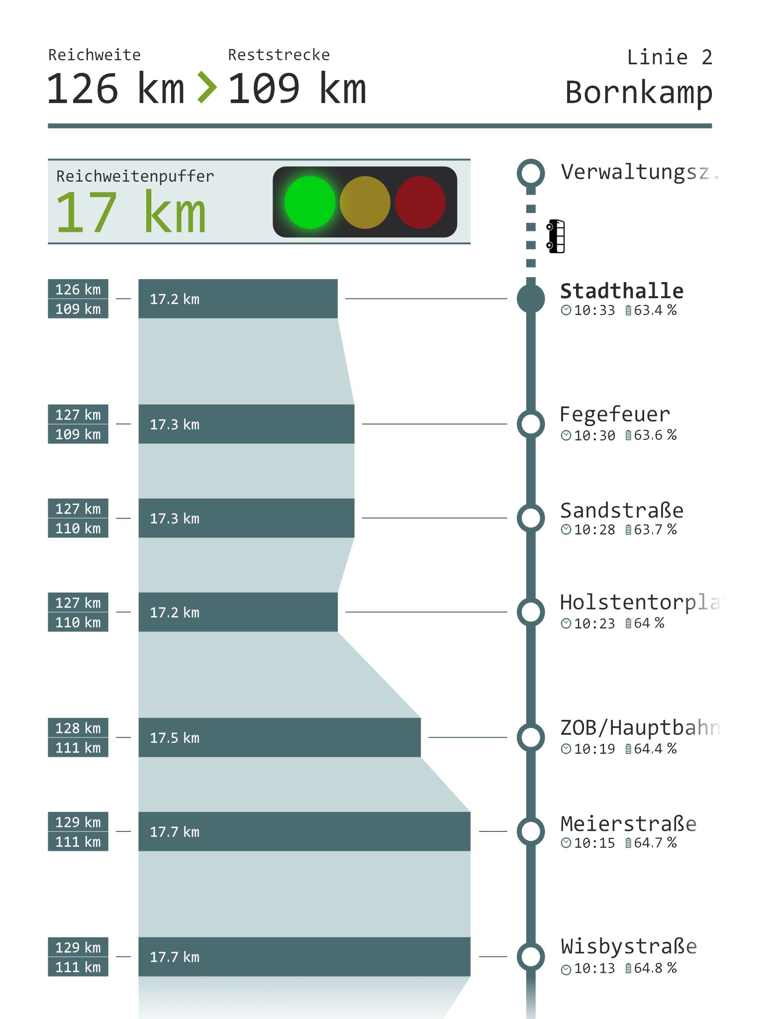 Dem Fahrer soll beispielsweise der Reichweitenverlauf in Bezug auf die nächsten Haltestellen angezeigt werden, so dass er nicht selbst die Restreichweite des Busses zur zurückzulegenden Linienstrecke ins Verhältnis setzen muss. Der aktuell verfügbare Sicherheitspuffer wird ihm direkt angezeigt. In einem anschließenden Feldversuch wird der entwickelte Prototyp eines Reichweitenassistenzsystems dann getestet.