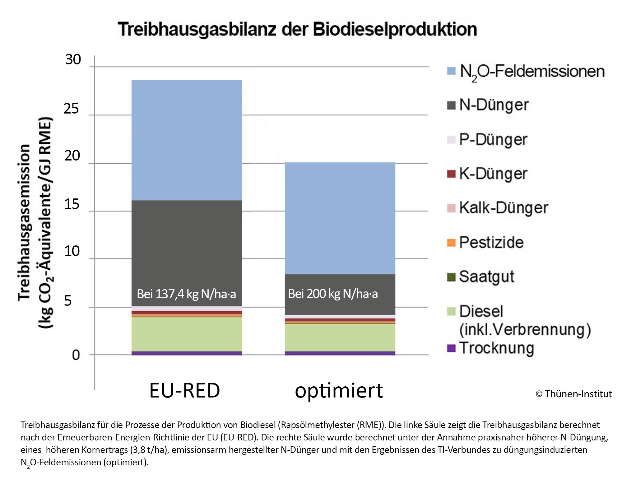 Raps ist die wichtigste Energiepflanze für Biokraftstoffe in Deutschland. Die mit Abstand höchsten THG-Emissionen im Rapsanbau entstehen durch Feldemissionen von Lachgas und die Herstellung des benötigten synthetischen N-Düngers. An diesen beiden Hebeln gilt es also anzusetzen, um die Vorgaben der EU (RL EU 2015/1513) einzuhalten. Danach müssen Biodiesel & Co. seit dem 1.1.2018 mindestens 60% (Altanlagen 50%) THG-Emissionen gegenüber fossilen Kraftstoffen einsparen. Für die THG-Bilanz können Biokraftstoffhersteller Standardwerte aus der Erneuerbare-Energien-Richtlinie der EU oder regionalisierte Inputwerte für die Betriebsmittel wie Dünger und Kraftstoff verwenden. Die Arbeiten des TI-Projekt-Verbundes haben nun ergeben, dass diese Werte für Deutschland unrealistisch sind. Die veranschlagte Düngermenge sei zu niedrig, der Lachgasemissionsfaktor insgesamt jedoch trotzdem zu hoch: Statt der angenommenen 34 kg N/t Raps seien 50 bis 56 kg praxisüblich, der Faktor für N2O liege aber nicht bei 1,0, sondern nur bei 0,6 Prozent. Zu diesem Schluss kommen die Wissenschaftler durch Anwendung einer neuen, differenzierteren Methodik nach Stehfest/Bouwman (2006). Sie appellieren, künftig diese Methode mit realistischen Werten anzuwenden, damit die THG-Bilanz von Raps-Biodiesel nicht schlechter ausfällt als sie tatsächlich ist.